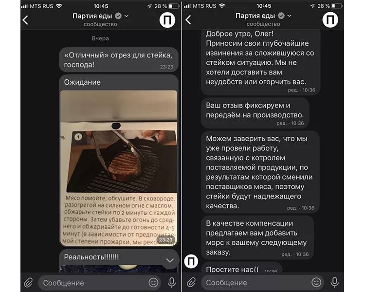 Отзыв поступил поздним вечером, отреагировали на него только в начале рабочего дня. Поддержка пишет: «фиксируем отзыв и передаем на производство», – то есть, они начали его обрабатывать в 10:36 – и сразу же продолжают: «уже сменили поставщика мяса». Выглядит не слишком-то правдоподобно, такие решения за минуту и даже за полтора часа не принимаются. Да и морс в качестве компенсации за полностью испорченный стейк выглядит сомнительно.