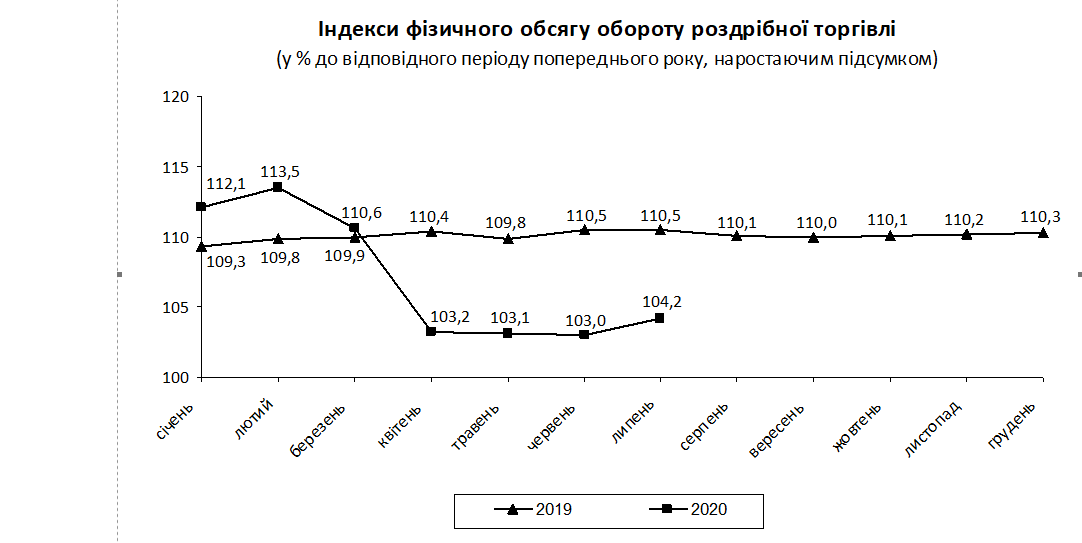 Согласно сообщению Госстата, Индекс физического объема оборота розничной торговли составил в январе-июле 2020 года 104,2% относительно января-июля 2019 года. По сравнению с показателями прошлого месяца, розница в июле выросла сразу на 12,1%, а относительно июля 2019 года – всего на 8,5%.