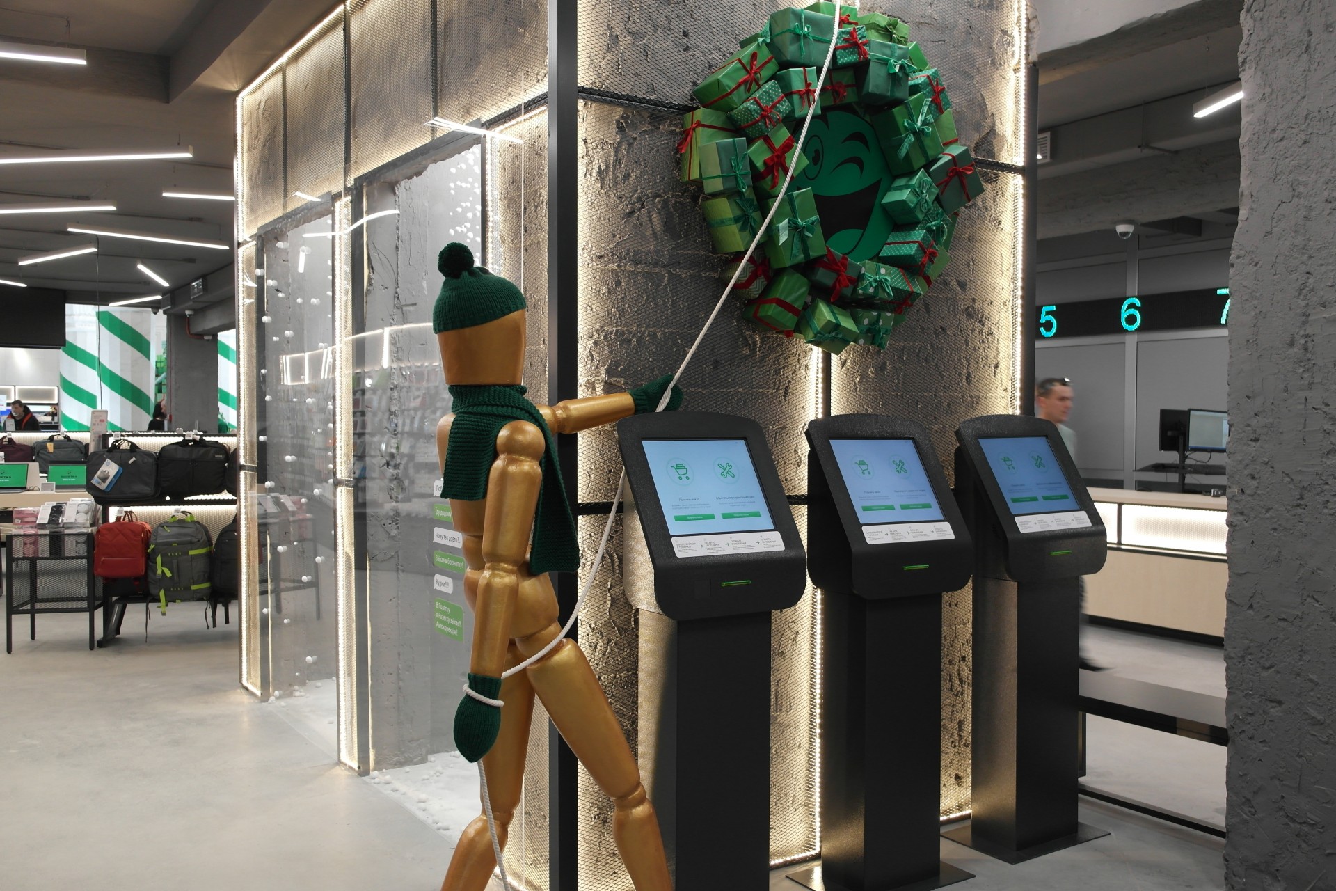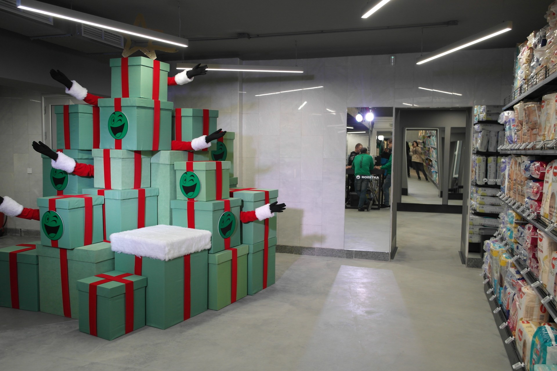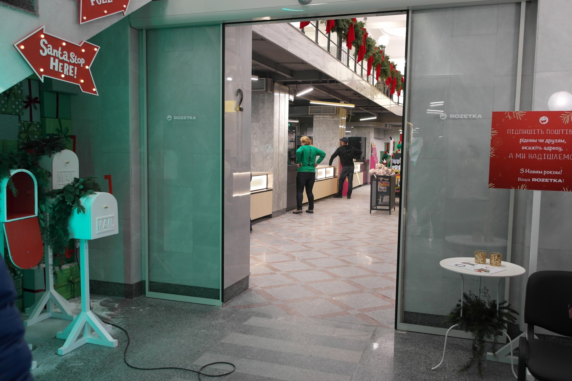 Сейчас магазин оформлен в новогоднем стиле, что в преддверии праздников не удивительно. Со входа посетителей встречает специальная фотозона, которых по всему магазину довольно много. В этой зоне специальный “представитель почты Деда Мороза” будет принимать поздравительные открытки, которые любой гость Rozetka cможет отправить своему другу, родственнику, или любимому человеку.