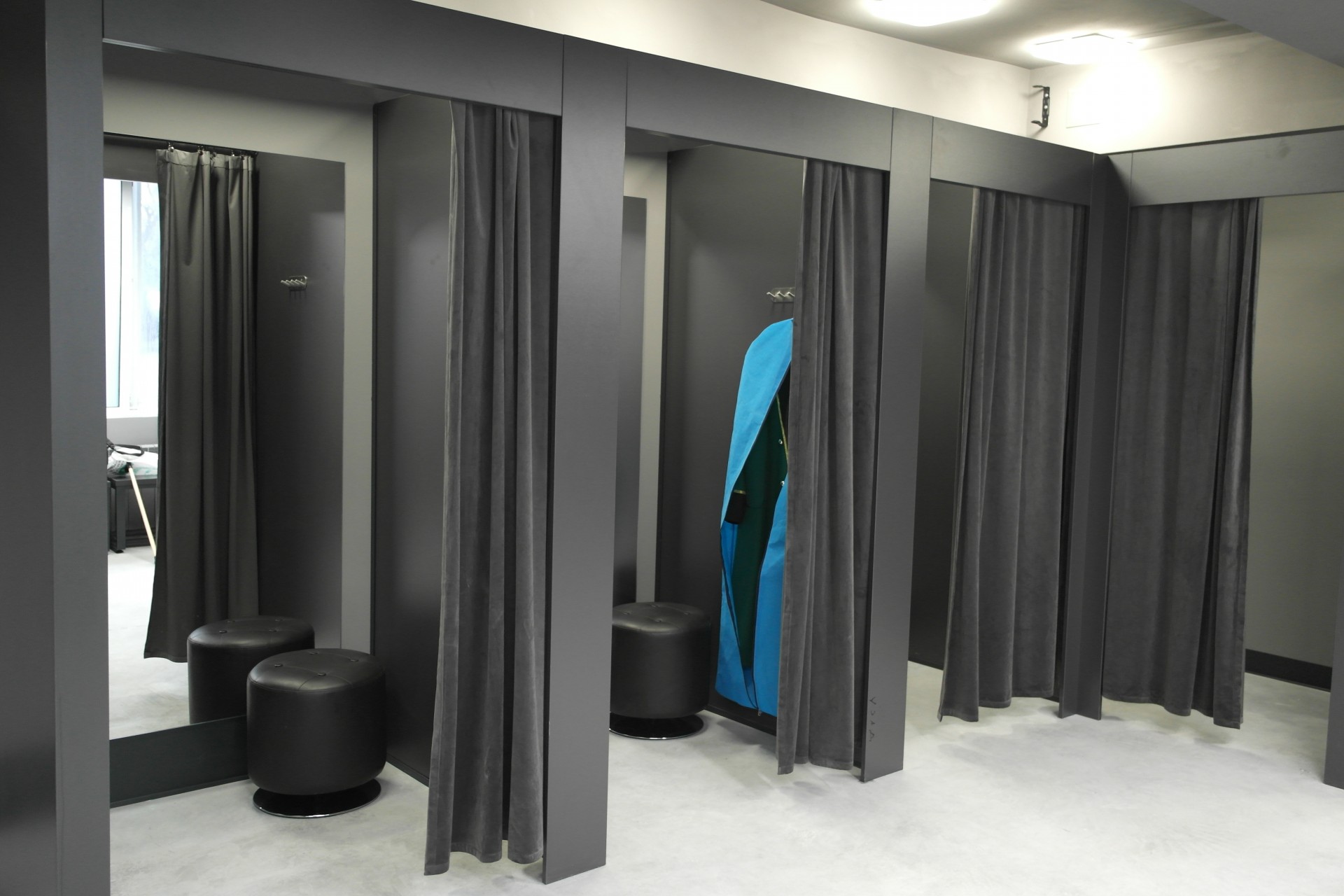 По пути к примерочным небольшой зал с fashion-продукцией, аксессуарами и сопутствующими товарами пока ожидает наполнения. За ним располагаются примерочные: 6 кабинок и стены с зеркалами.