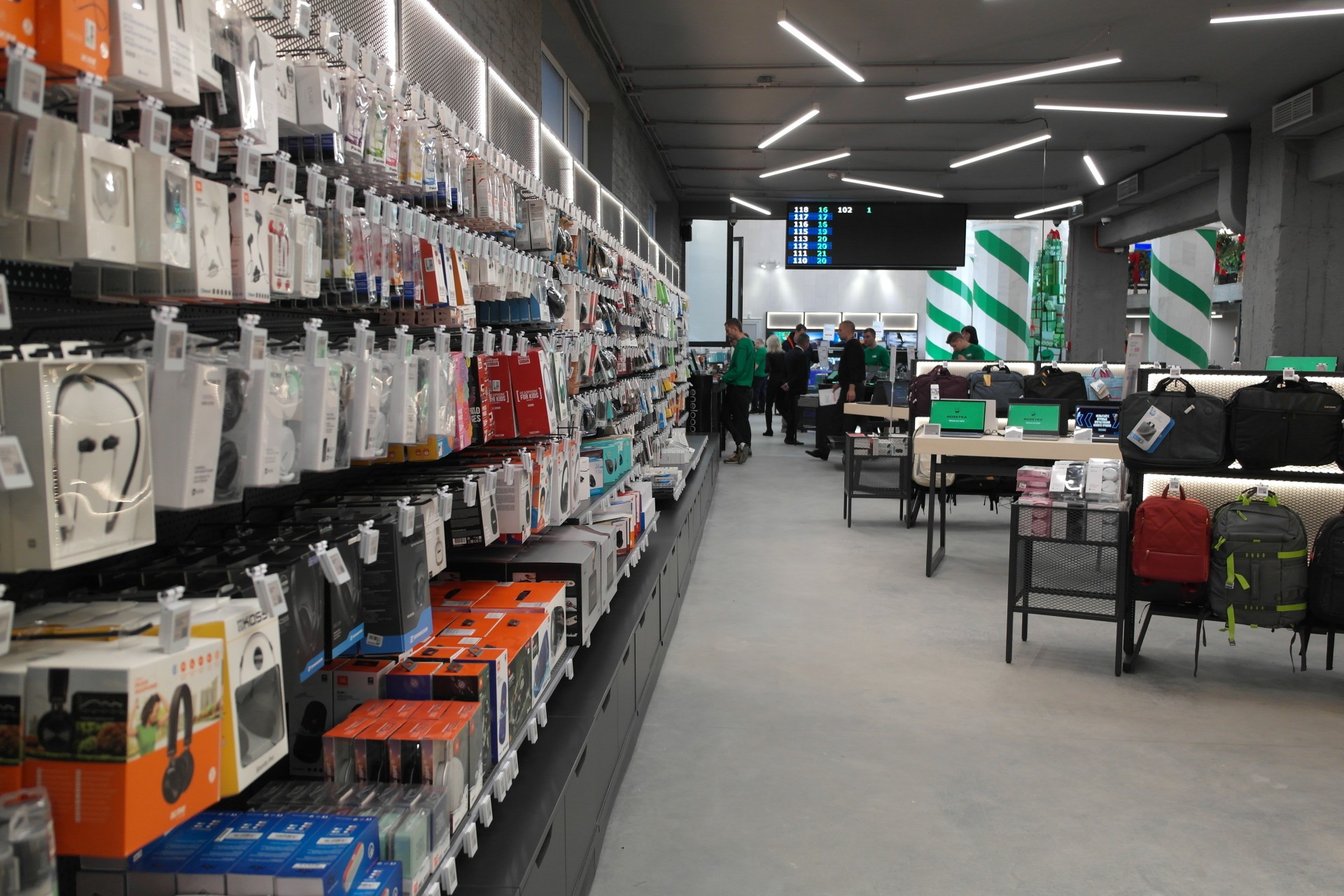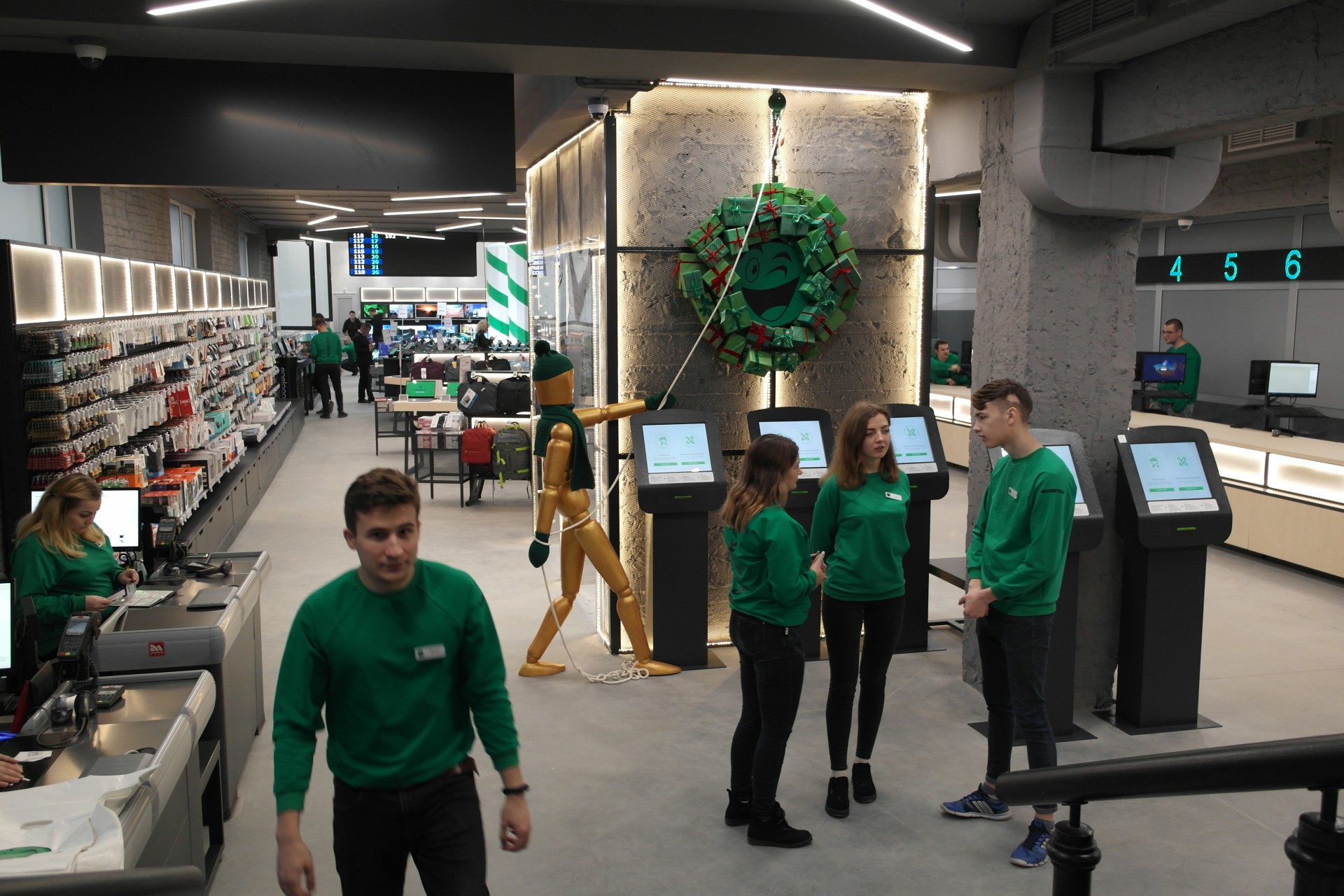 Магазин, как и предыдущий торговый объект ритейлера, оснащен экспресс-кассами в каждом из залов, имеет несколько стоек информации, две линии точек выдачи, а также электронный Check in в каждом из залов, который помогает получить заказ или талон в сервисный центр.