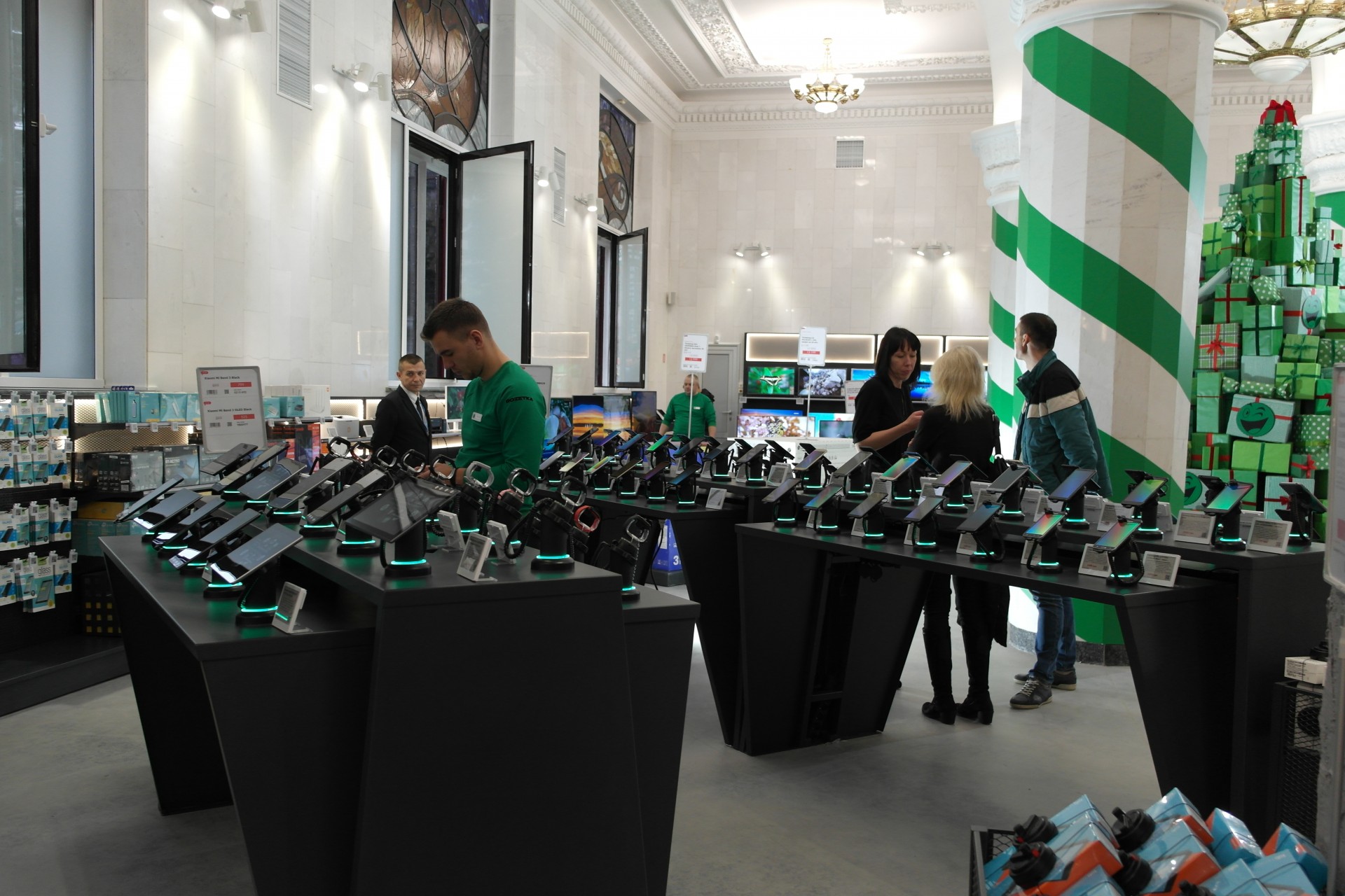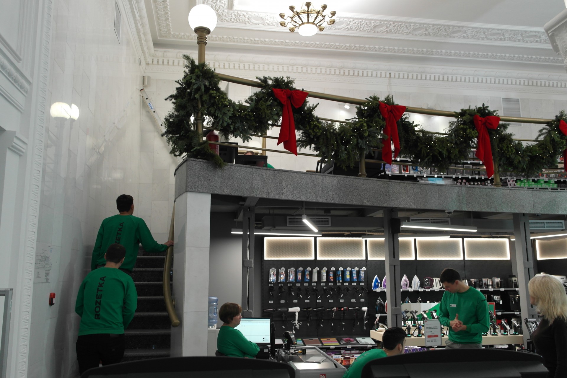 Фоторепортаж с открытия магазина Rozetka в помещении столичного Главпочтамта: как ритейлеру удалось вписать современные стеллажи в советские интерьеры.