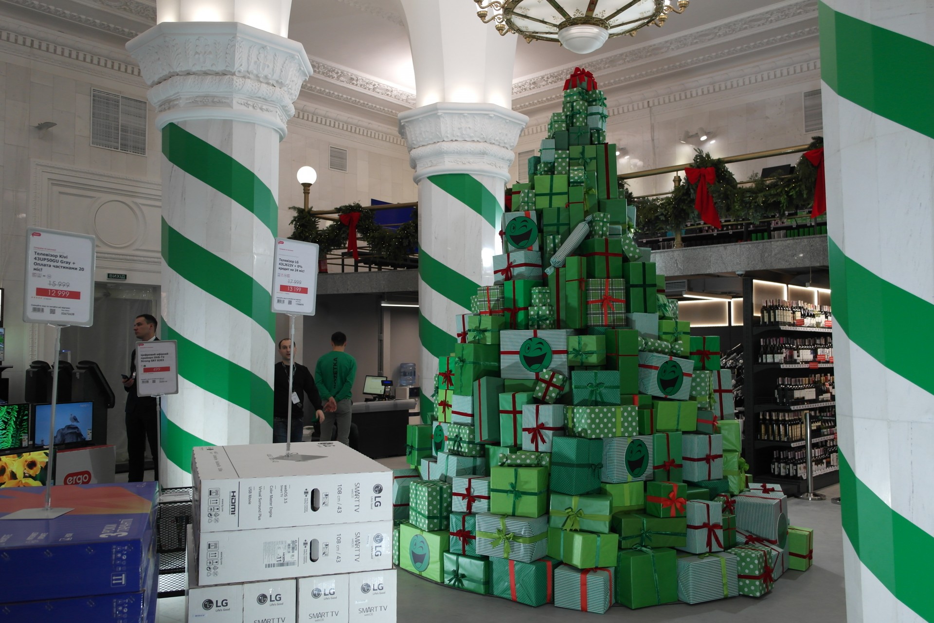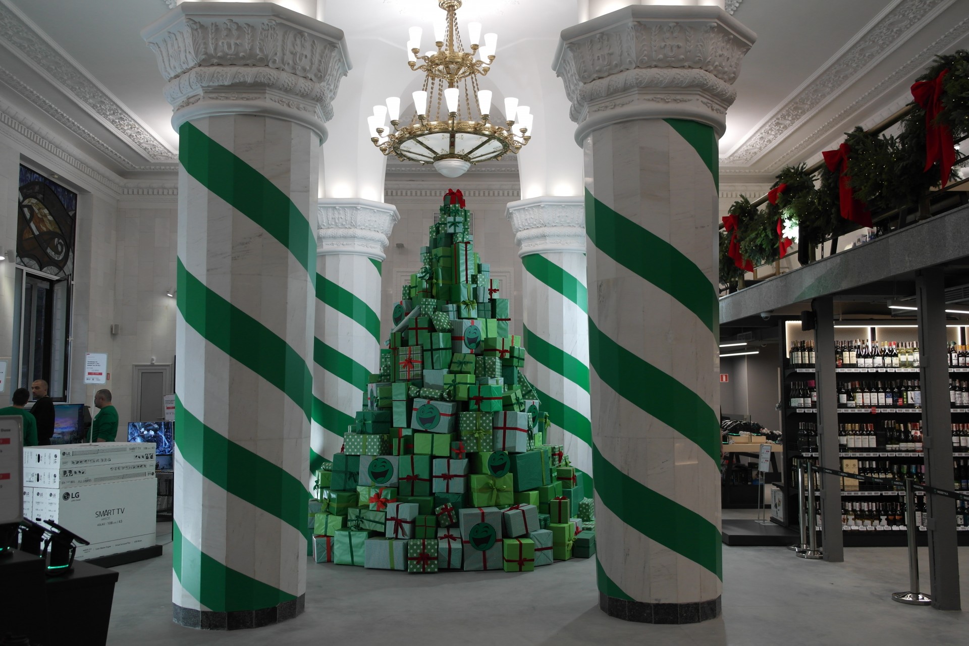В центре зала расположена еще одна тематическая зона – огромная елка из брендированных подарочных коробок достает практически до массивной люстры.