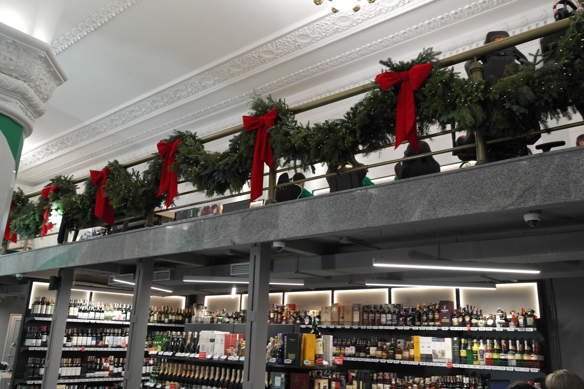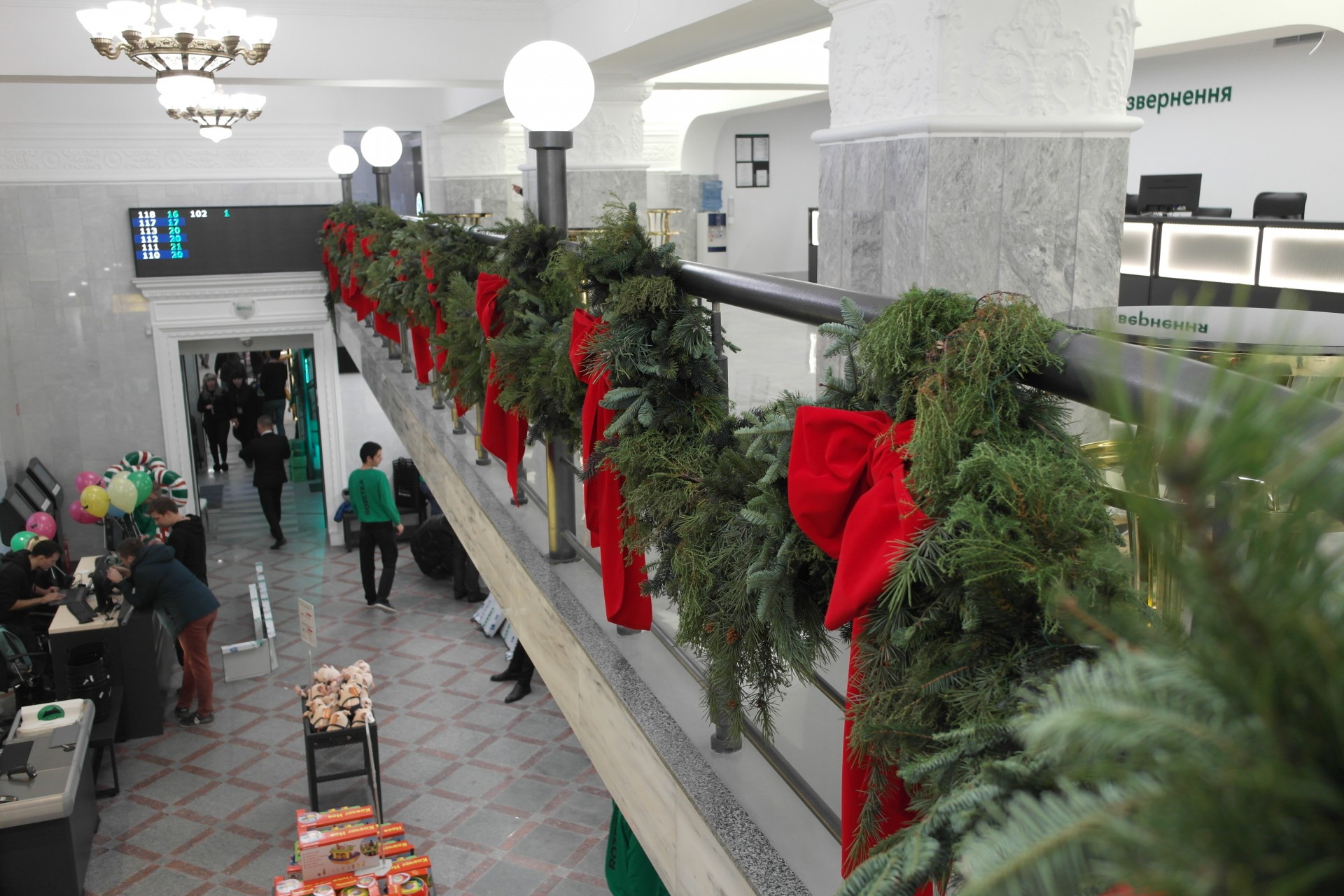 Зона сервиса, расположенная на втором этаже прямо напротив входной группы, также украшена елочными ветвями и бантами.