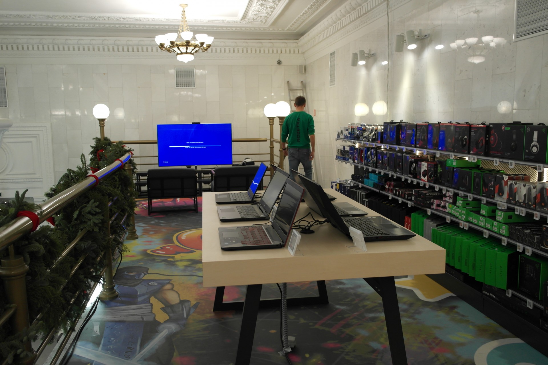 Тут можно увидеть пол со специальным покрытием, изображающий самых популярных героев игр. Здесь же представлен ассортимент товаров для геймеров.