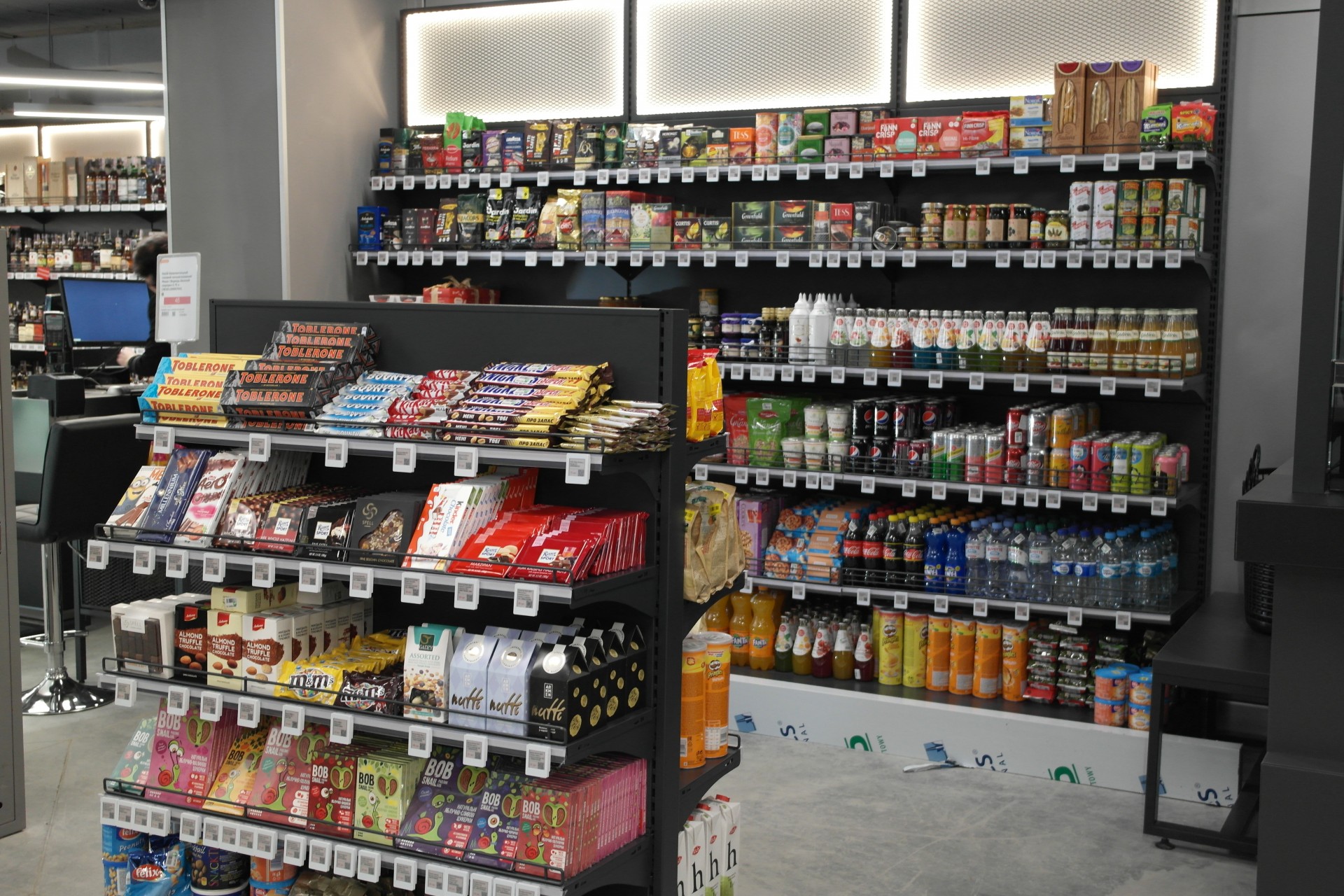 Помимо техники, электроники и аксессуаров, в этом зале также представлены некоторые продукты, по большей части снэки и алкогольная продукция с отдельными экспресс-кассами.
