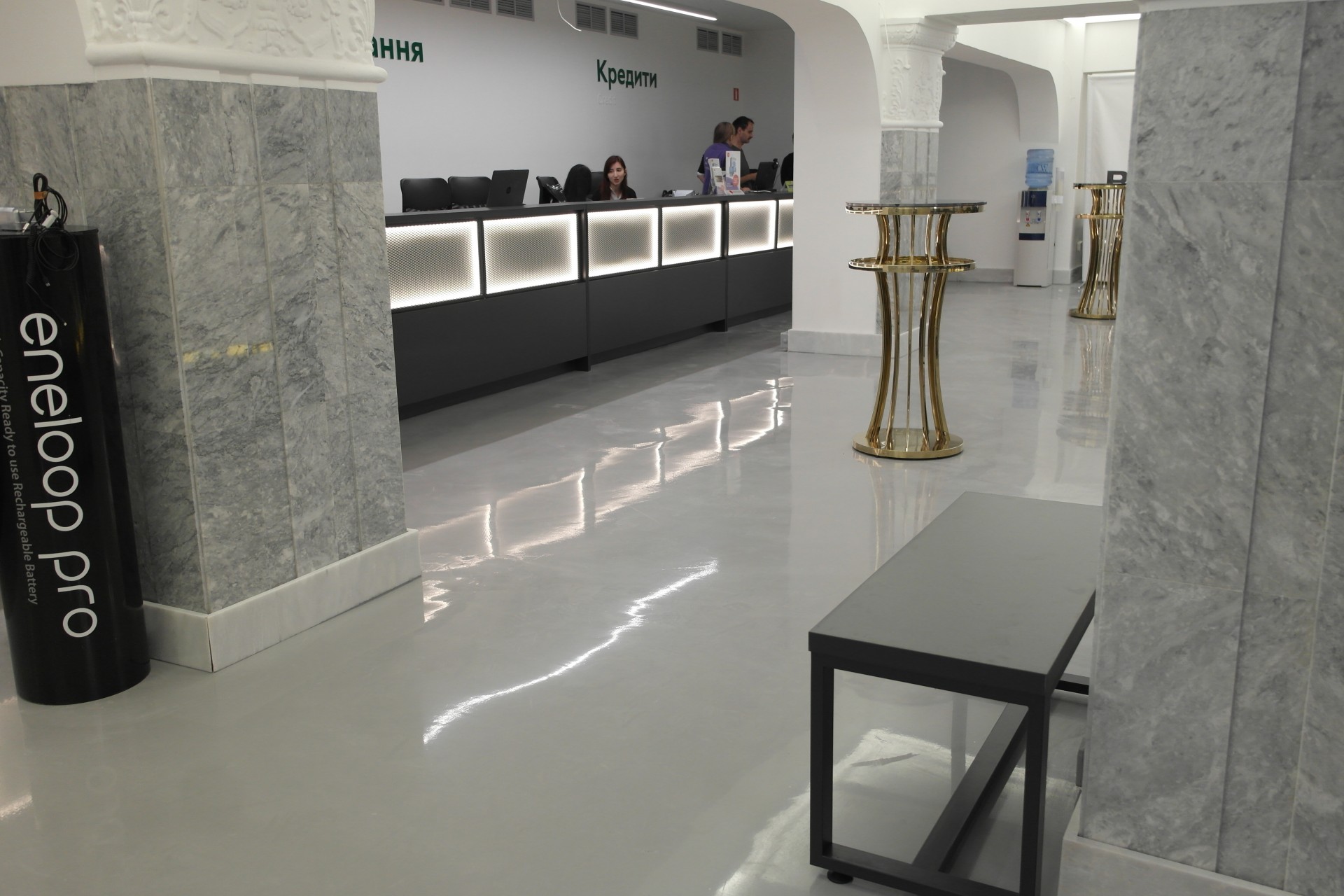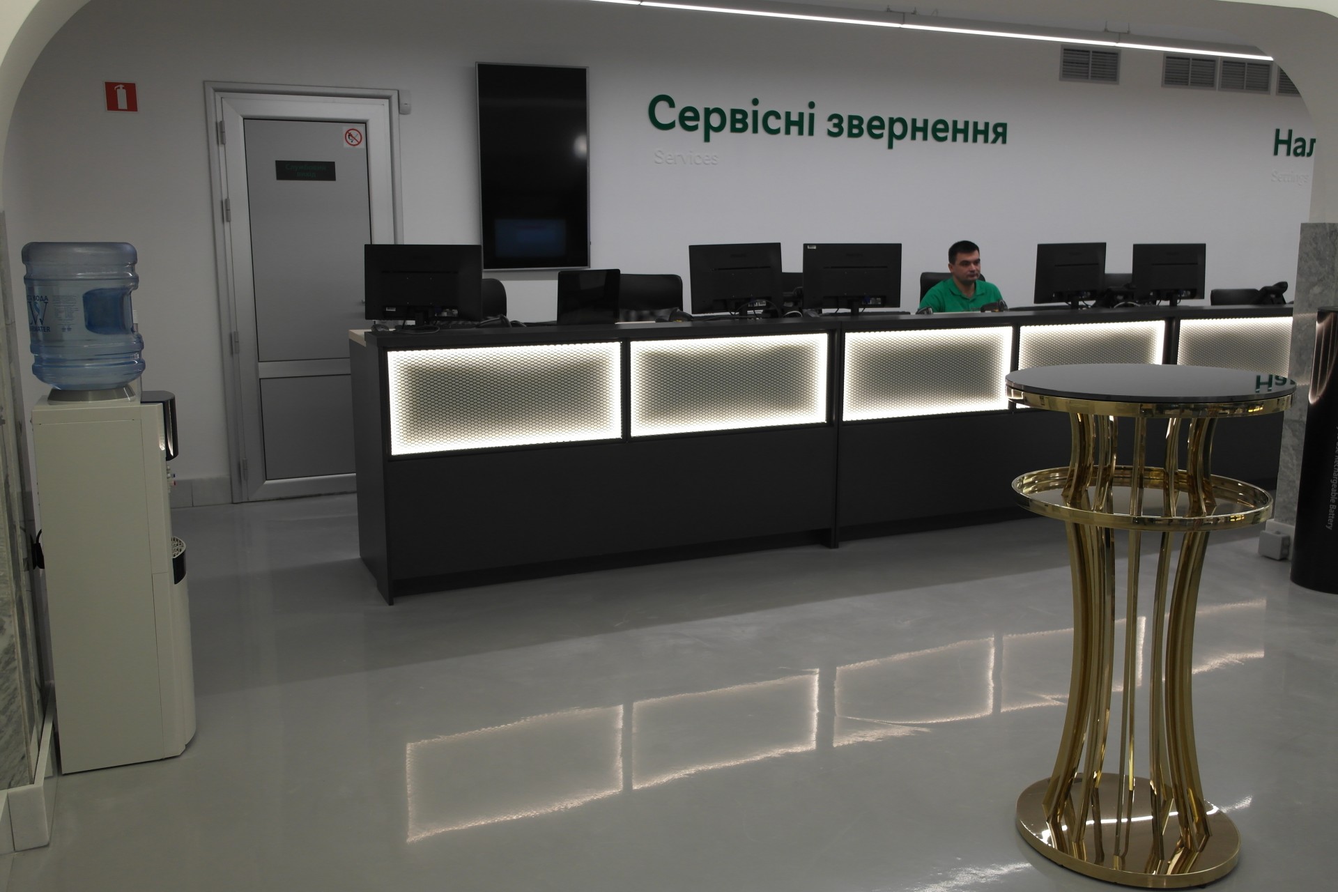 В этом зале клиенты могут получить необходимые настройки для техники, сдать ее в ремонт, или оформить кредит на товар. В зале расположены скамейки, чтобы клиент мог отдохнуть, дожидаясь своей очереди. Кроме мест отдыха в каждом из залов есть кулеры с водой.