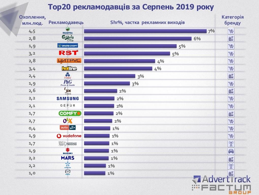 Помимо Rozetka в топ-20 крупнейших рекламодателей UAnet в августе вошли e-commerce-площадки RST, HotLine, Gepur, OLX и Auto Ria, а также сети магазинов Драйв Спорт, Цитрус и Comfy.