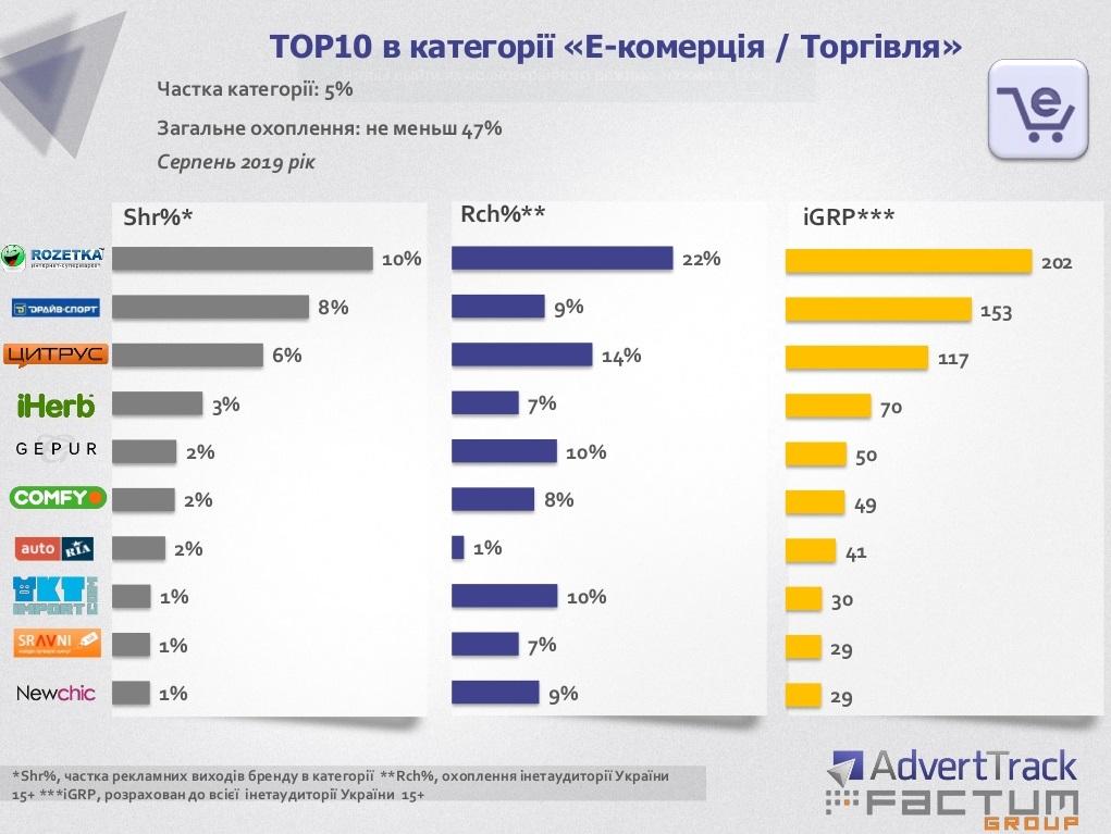 Что касается десятки крупнейших рекламодаталей категории e-commerce/торговля, то помимо Rozetka, Драйв Спорт и Цитрус, сюда вошли такие бренды как iHerb, Gepur, Comfy, Auto Ria и другие.