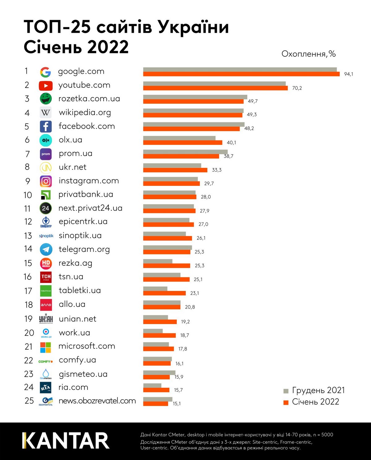 Первый месяц 2022 года был насыщен событиями, за которыми активно следили украинцы. Следовательно, в рейтинг вошли сразу три новостных сайта: Tsn.ua (16-е место), Unian.net (19-е место) и News.obozrevatel.com (25-е место).
