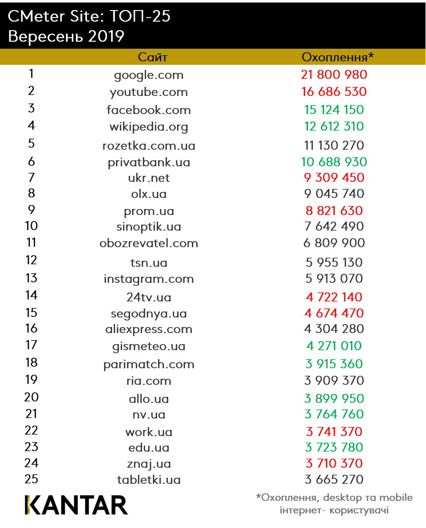 Ряд новостных сайтов даже немного улучшил свои позиции (на один-два уровня). Особенностью сентября стало исчезновение из топ-25 самых популярных сайтов UAnet запрещенной соцсети vk.com, которая была на 17-м месте в прошлом месяце. Зато сразу на 18-той строчке появилась букмекерская контора parimatch.com.