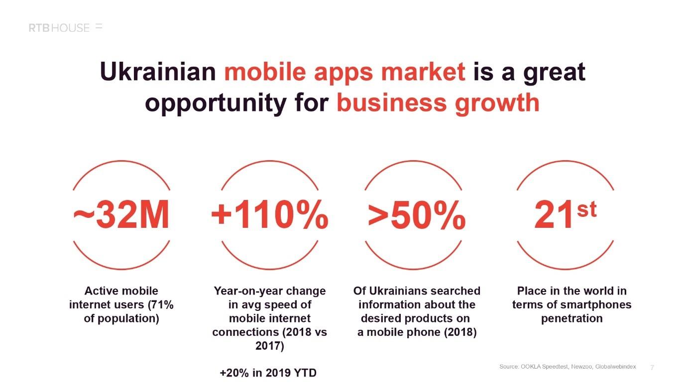 Главный менеджер по развитию бизнеса RTB House в Украине Александр Марусяк поделился результатами аналитического исследования, проведенного компанией в августе 2019 года. В частности, Украина занимает третье место на рынке интернет-рекламы в Центральной и Восточной Европе по объему кликов и показов рекламы.