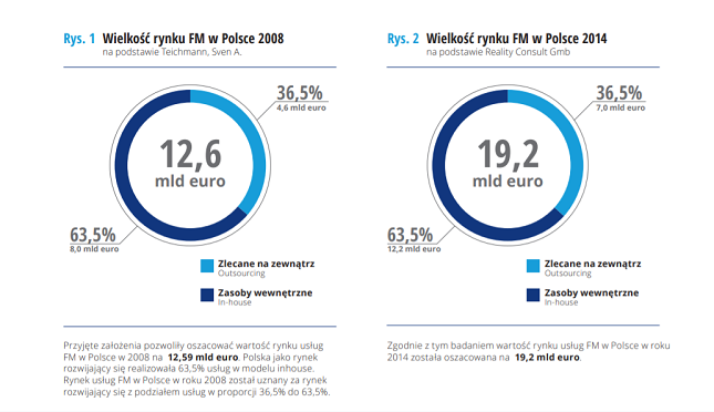 В 2014 году объем рынка FM Польши составил 19,2 млрд евро, по сравнению с 12,6 в 2008-м, о чем свидетельствуют данные подобного исследования, проведенного компанией Reality Consult GmbH, которая тоже базировалась на оценочных данных и принятых факторах. Доля рынка FM в ВВП была на уровне около 5% (см. рис. 1, 2).