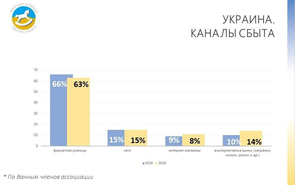 По каналам сбыта в Украине, согласно данным членов УАИИ, форматные магазины на 3% уменьшили свою долю в продажах и теперь составляют 63% от общего объема. Потребители стали чаще искать альтернативные источники для покупки – заправки, книжные магазины, киоски и рынки (14%), большие FMCG-сети и мелкие супермаркеты у дома (8%), или же интернет. Интересно, что онлайн-продажи несколько упали, заняв в этом году лишь 8% торговли игрушек, что на 1% меньше по сравнению с предыдущим периодом.