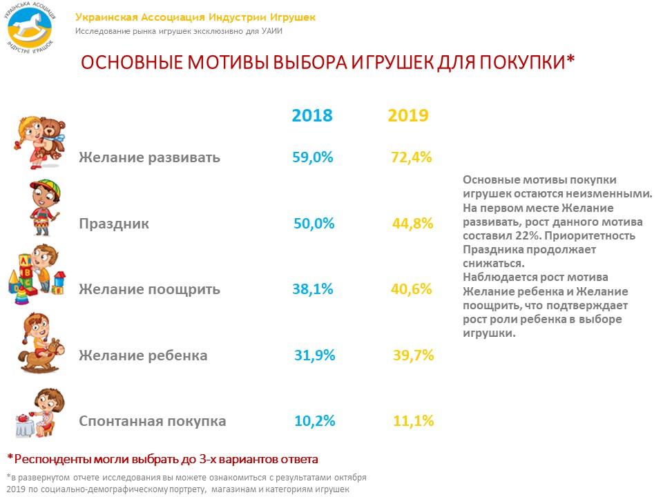 По данным исследования УАИИ, в 79,1% случаев решение о покупке игрушки принимает мама. Роль папы в принятии решения, хоть незначительно, но выросла. Усиливается желание ребенка влиять на процесс покупки – роль ребенка выросла на 61% в сравнении с исследованием 2018 года и на 89% в сравнении с исследованием октября 2017 года. В то же время мама покупает игрушки в 4,7 раза чаще папы. Отмечается, что частота покупки игрушки папой из года в год продолжает снижаться.
