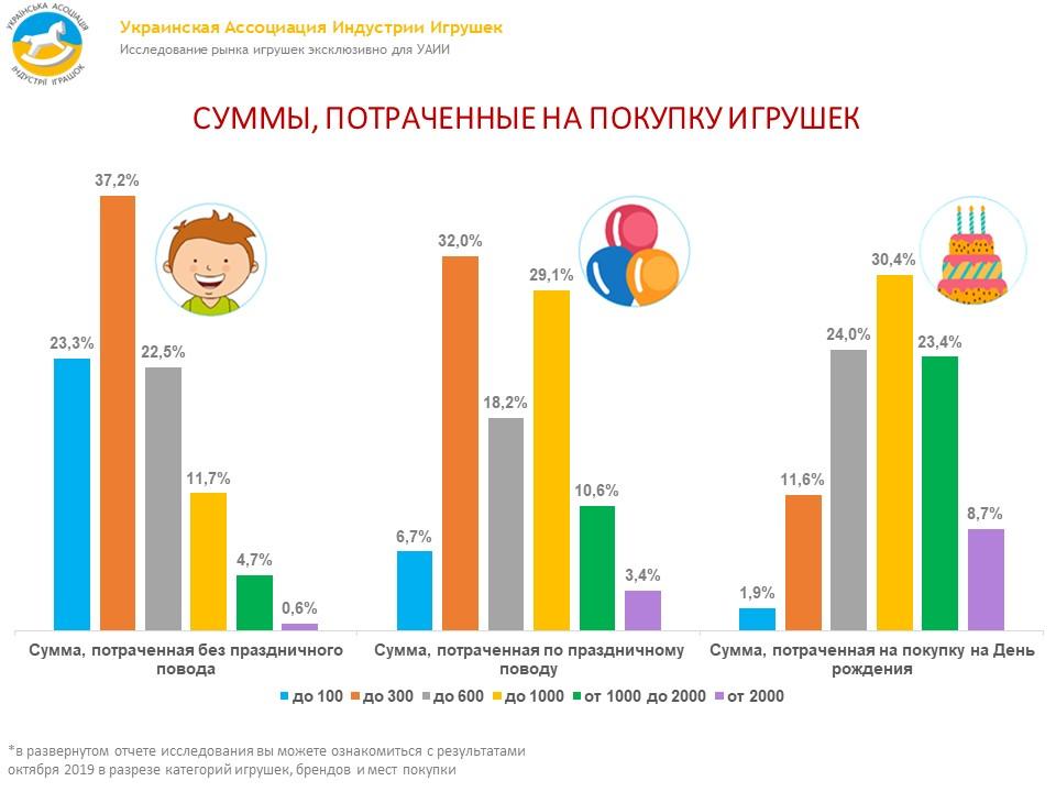 Наибольшие суммы тратятся на покупку ко Дню рождения, причем в этом году в графике впервые сумма стала превышать 2000 грн. По словам Павла Овчинникова, сказывается девальвация гривни. В 2019 году 33,1% респондентов готовы тратить на покупку игрушки от 1000 грн и более. Также наблюдается рост количества покупки игрушек стоимостью от 600 до 1000 грн. А вот игрушки дешевле 600 грн стали покупать заметно реже. Что касается мелких сумм до 300 грн, то чаще всего их тратят без какого-либо календарного повода.