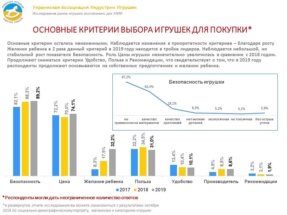 Основные критерии выбора игрушки с прошлого года остались неизменными. Но наблюдается изменение в приоритетности критериев – благодаря росту вдвое «Желания ребенка», данный критерий в 2019 году находится в тройке лидеров. Наблюдается небольшой, но стабильный рост показателя «Безопасность игрушки», которую большинство называют для себя приоритетной, хотя в итоге покупают подешевле.
