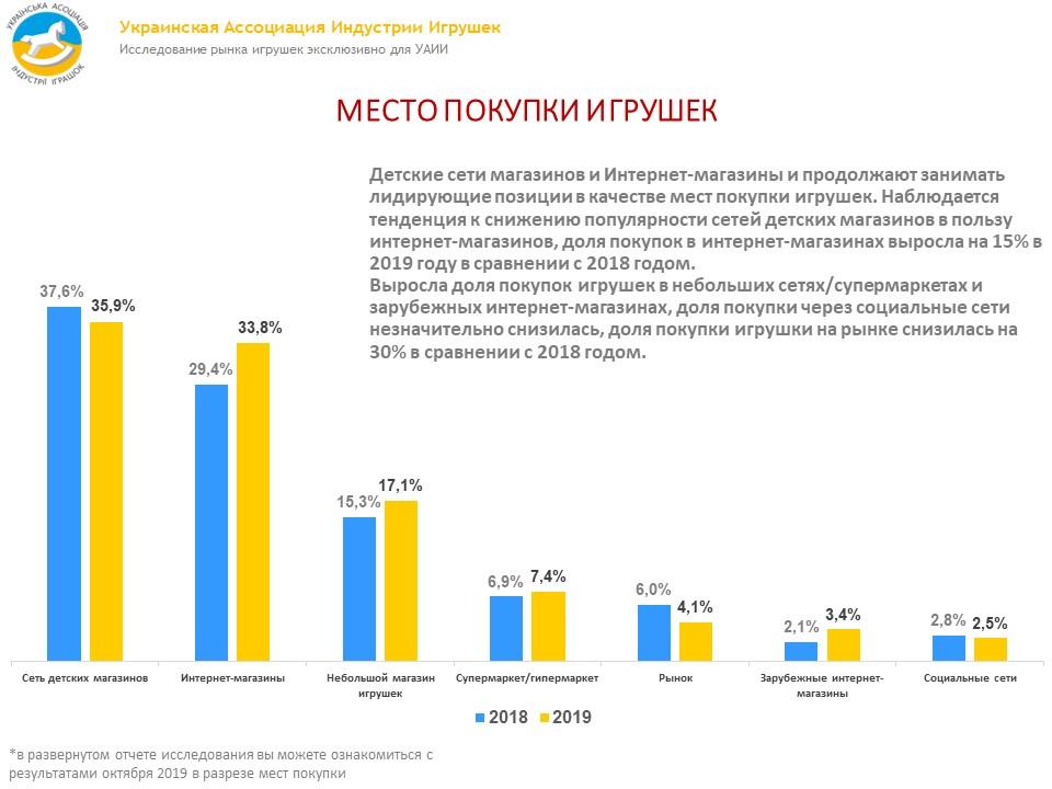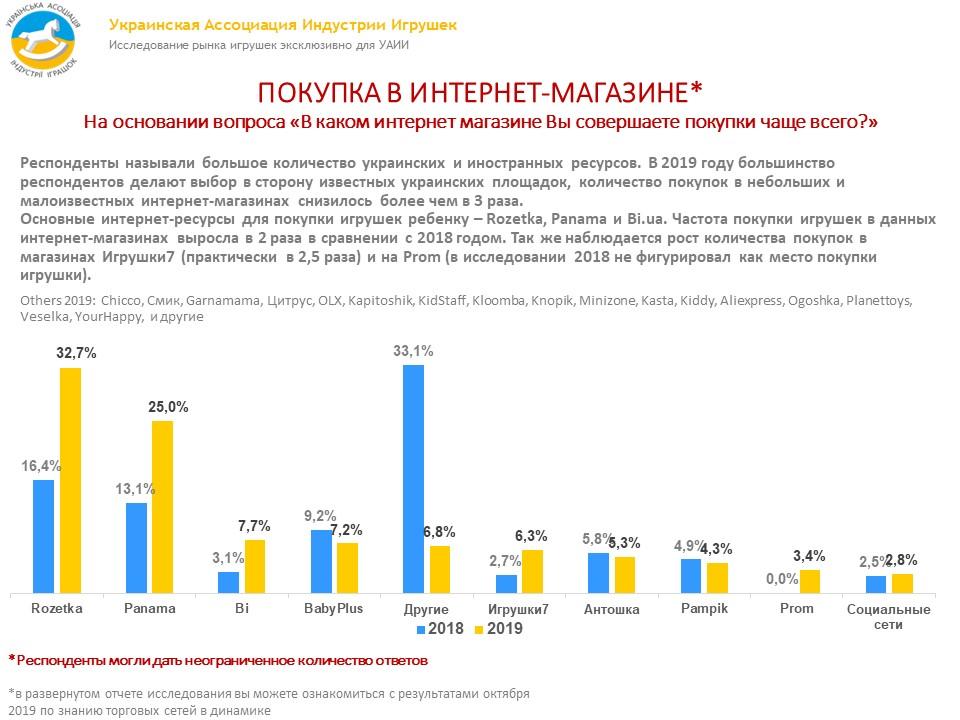32,7% респондентов выбирают Rozetka при выборе интернет-магазина для покупки игрушек, 25% — Panama, 7,7% — сайт омниканального ритейлера Будинок Іграшок. Частота покупки игрушек в данных интернет-магазинах выросла в два раза в сравнении с 2018 годом. Также наблюдается рост количества покупок в магазинах «Игрушки7» (практически в 2,5 раза) и на Prom (в исследовании 2018 года не фигурировал как место покупки игрушек).