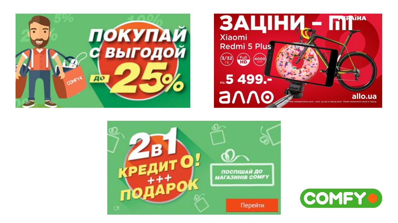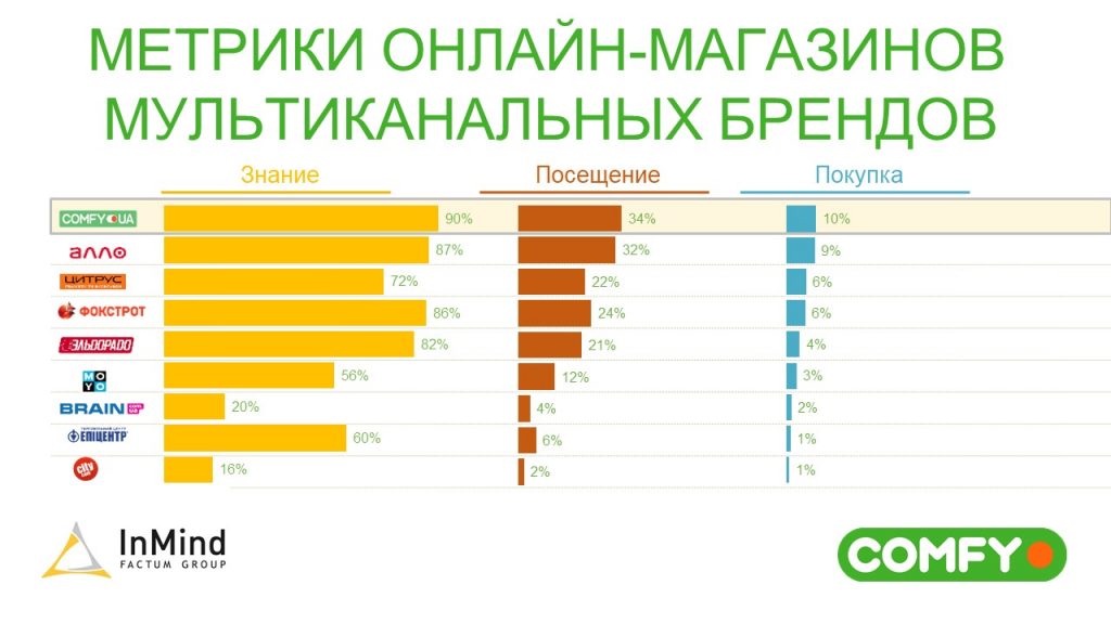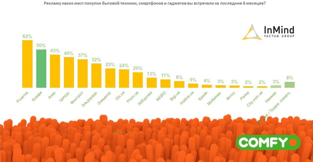 Как я уже говорил, Comfy не входит в топ-рекламодателей Украины. Мы не тратим много денег на коммуникации. Но согласно исследованию Factum Group Ukraine, из всей украинской рекламы магазинов бытовой техники и электроники в интернете, люди ставят по узнаваемости Comfy в топ – Comfy уверенно держится на втором месте.