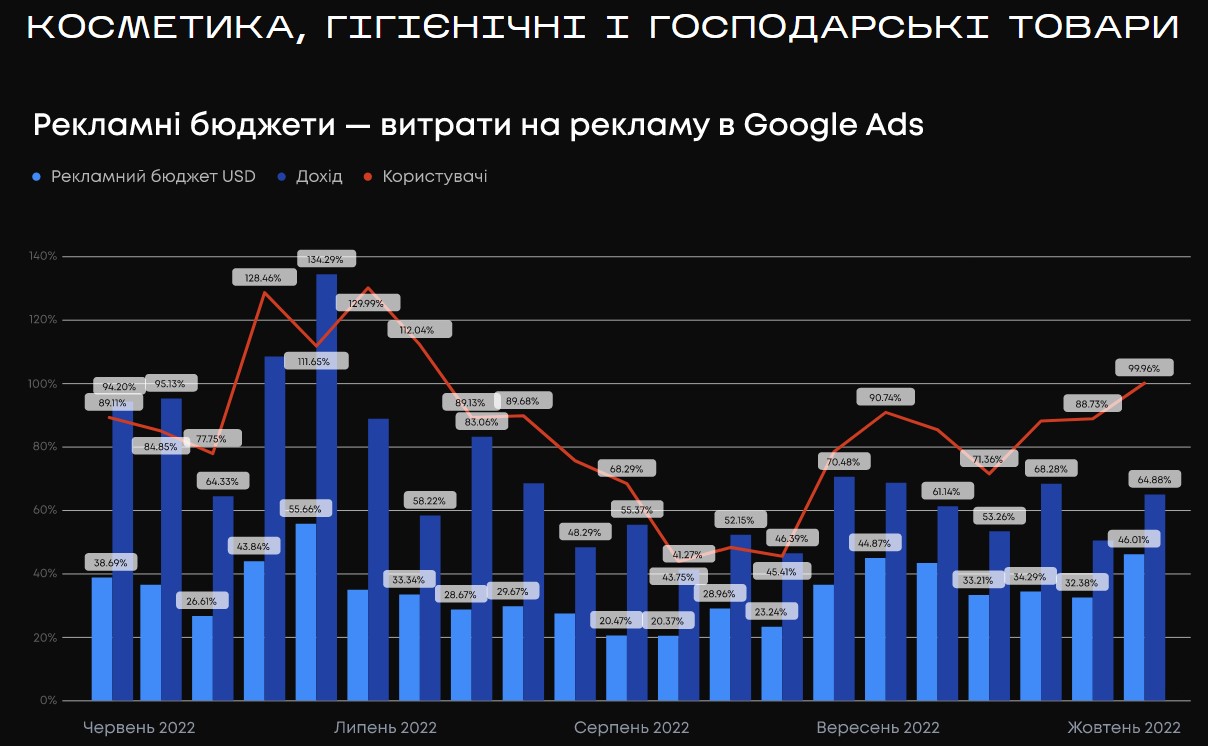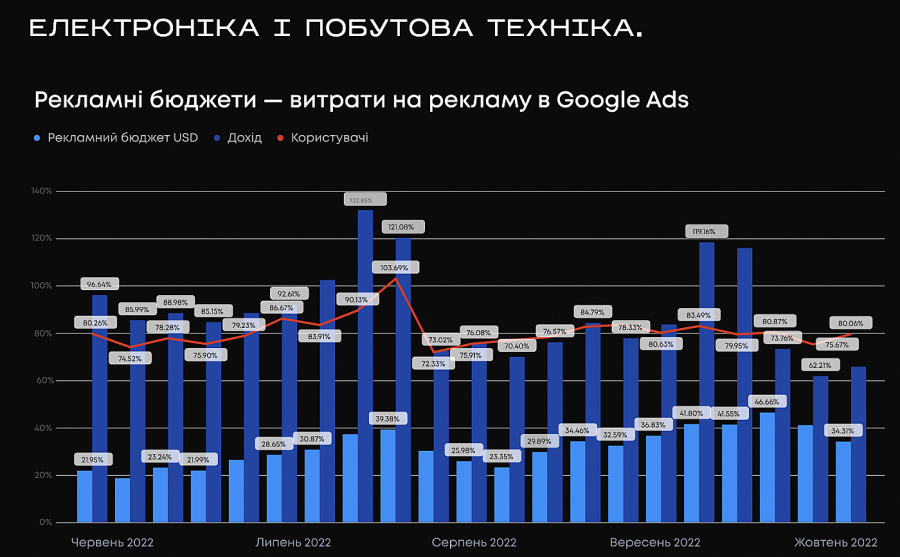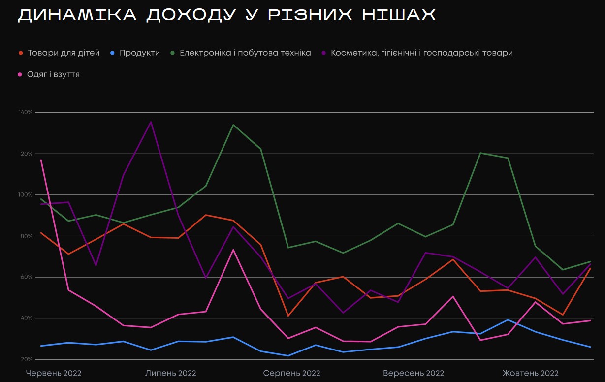 - Если рассматривать доход в гривневом эквиваленте, категории “Товары для детей” и “Косметика” почти достигли значений прошлого года, а категория “Электроника и бытовая техника” в среднем на 10-15% превысила показатели 2021-го. Однако, если посмотреть в долларовом эквиваленте, видим сильную просадку по всем нишам, кроме электроники — здесь процент падения незначителен. Преимущественно это связано со спонтанными покупками при росте курса и повышенном спросе на товары, необходимые при отключении электроэнергии. И здесь возникает вопрос с наличием: кто из игроков обеспечит постоянное наличие — тот заберет покупателей в жаркий сезон.
