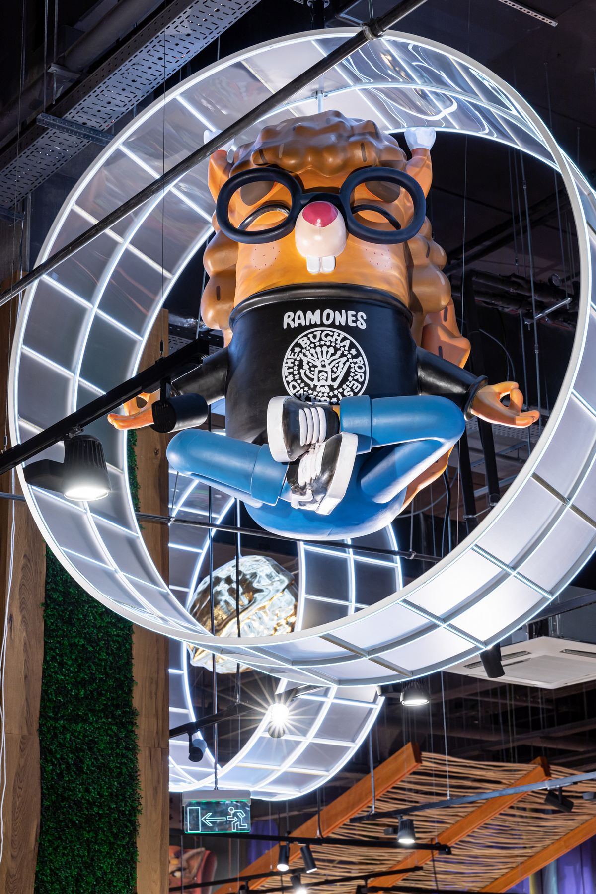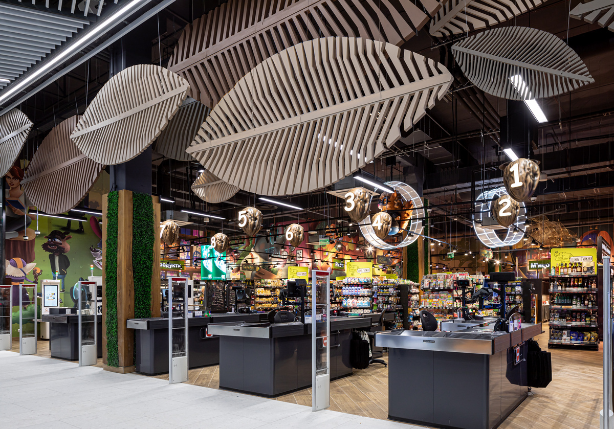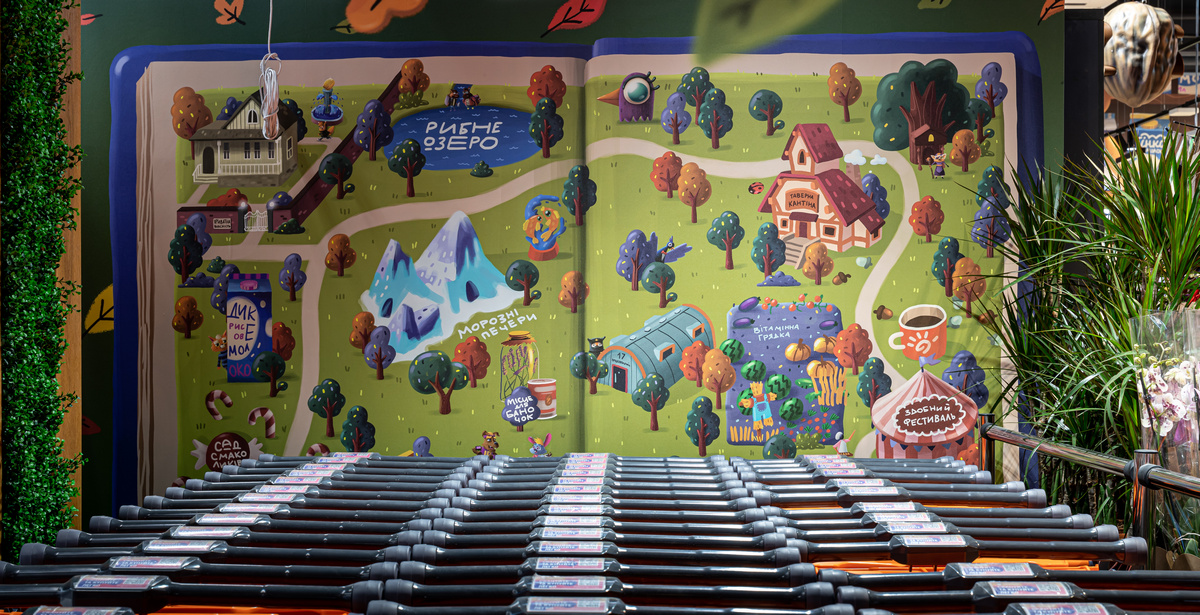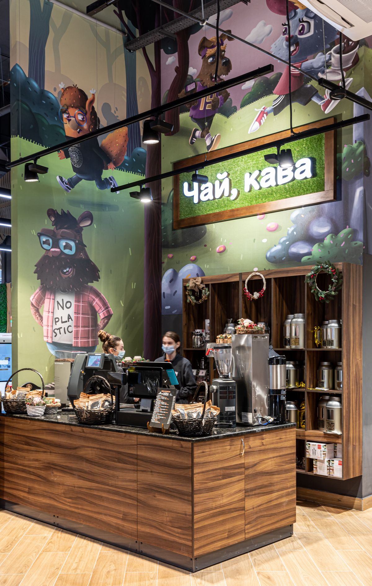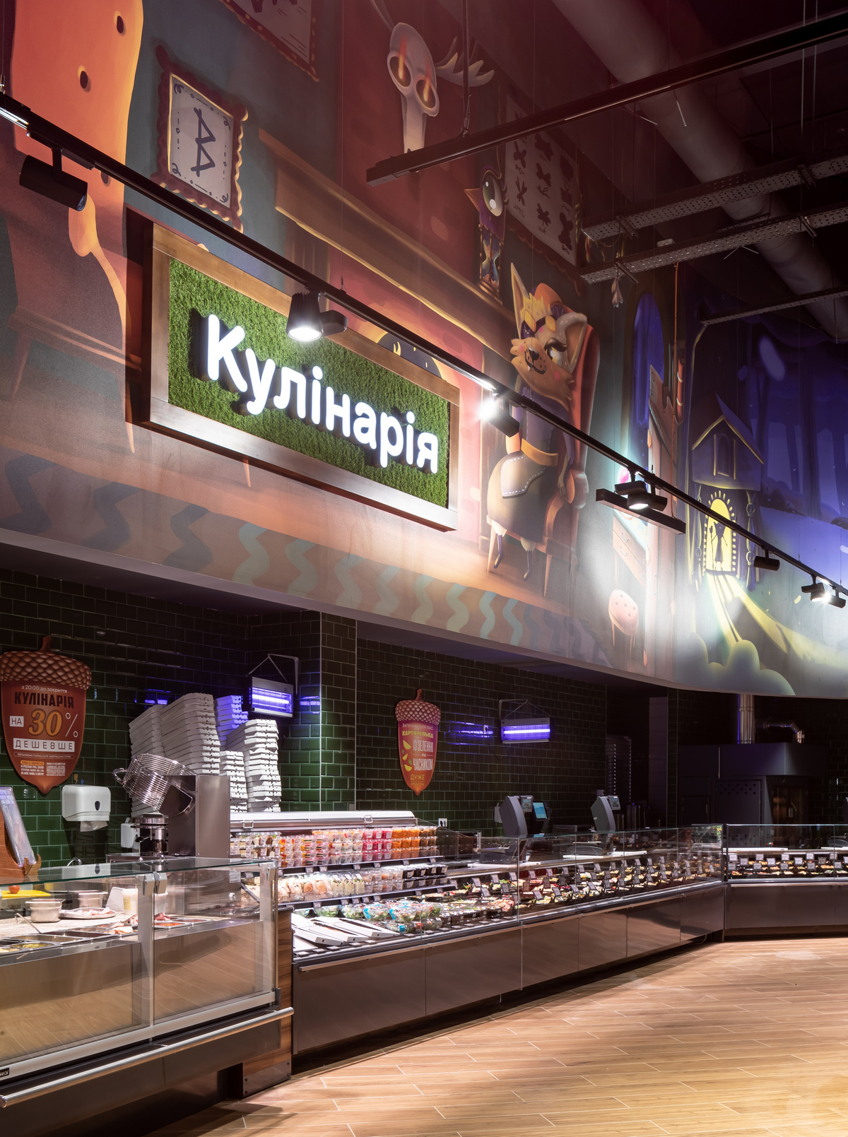 Героями интерьера нового Сільпо стали лес и звери. Например, персонажи книги наблюдают за гостями из дерева во фруктово-овощном отделе, а в колесе под потолком медитирует главная героиня – Белка-Детективка. Она напоминает, как важно замедлиться и без суеты выбрать из огромного ассортимента именно те продукты, которые придутся по вкусу.