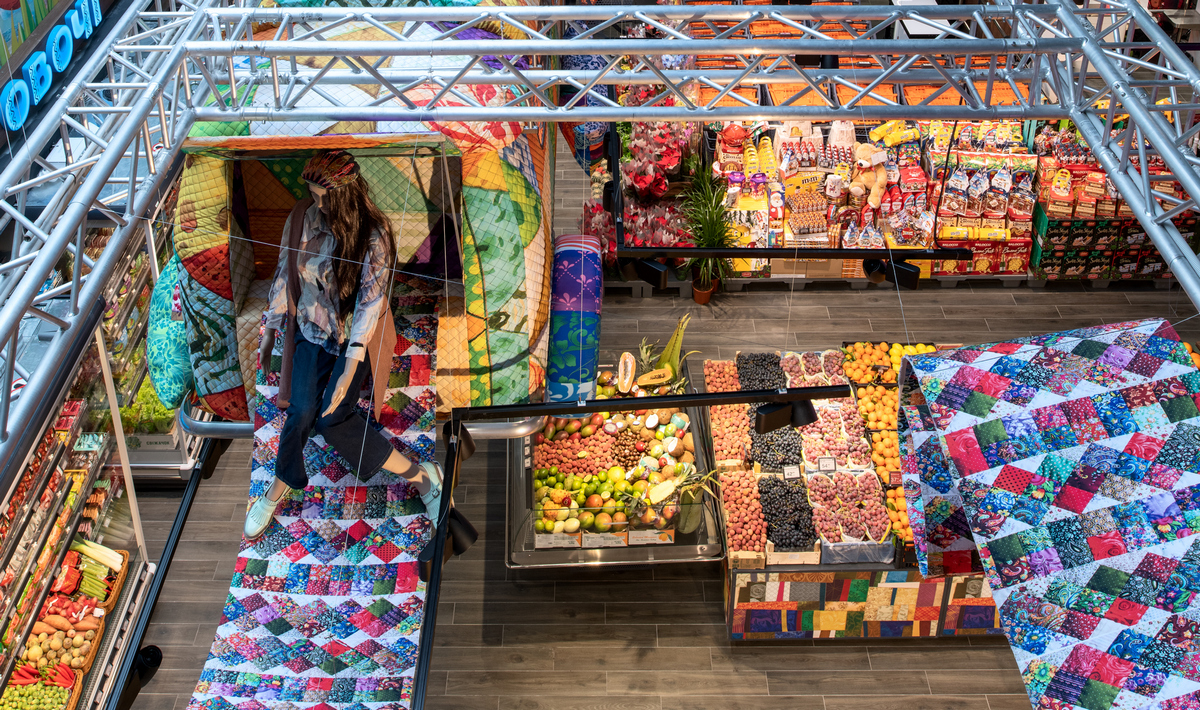 Большое количество лоскутов, из которых состоит одеяло-квилт, подчеркивает богатый выбор свежих овощей и фруктов в новом Сільпо. А разнообразие цветов указывает на многообразие готовых блюд в отделе кулинарии. Особый домашний уют придает аромат ароматной выпечки из собственной пекарни Сільпо. Гостям нового супермаркета предлагается большой выбор мяса, рыбы и вакуумной продукции. Всё это можно приобрести самостоятельно или заказать доставку.