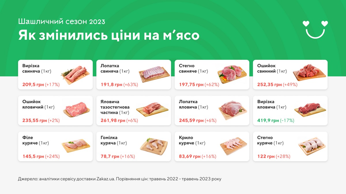 Аналитики сервиса доставки Zakaz.ua проанализировали цены на мясо, которое в разгар шашлычного сезона чаще всего покупают в ведущих сетях ритейлеров таких как: Metro, Auchan, Varus, Novus, Ultramarket и других. Выяснилось, что в мае 2023 года шашлык украинцам обойдется в среднем на 45% дороже, чем в прошлом. Цены выросли почти на все виды мяса. Больше всего подскочила цена на свинину, меньше всего изменились цены на говядину.