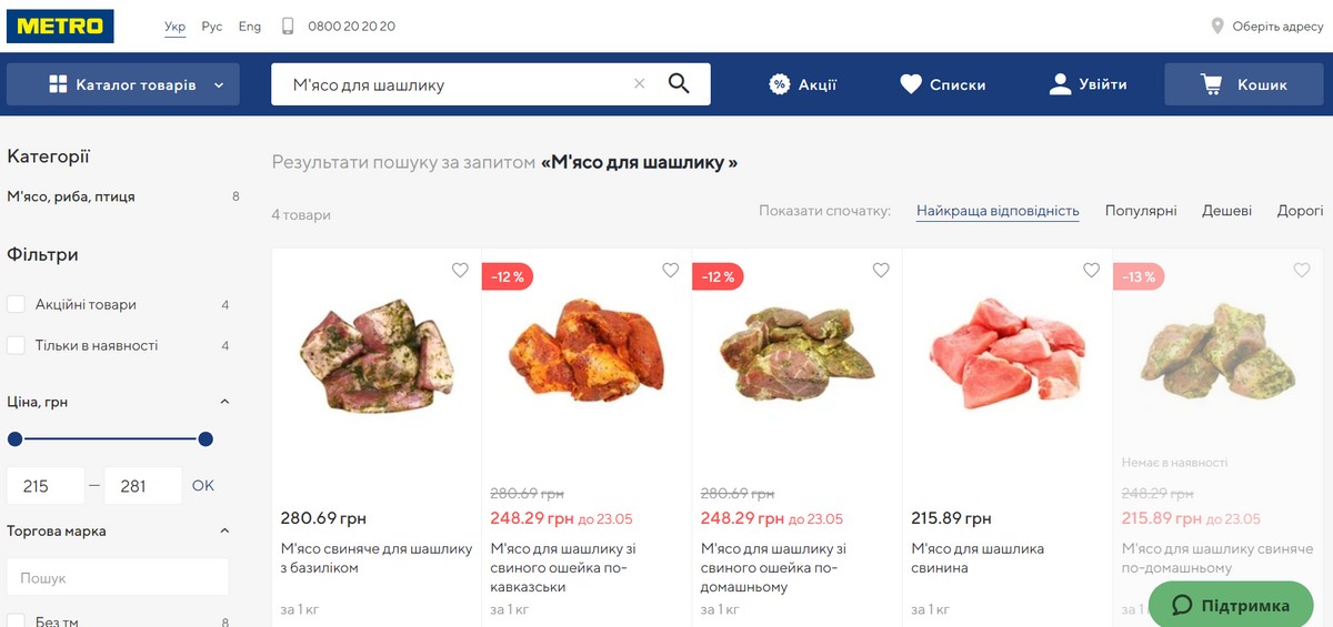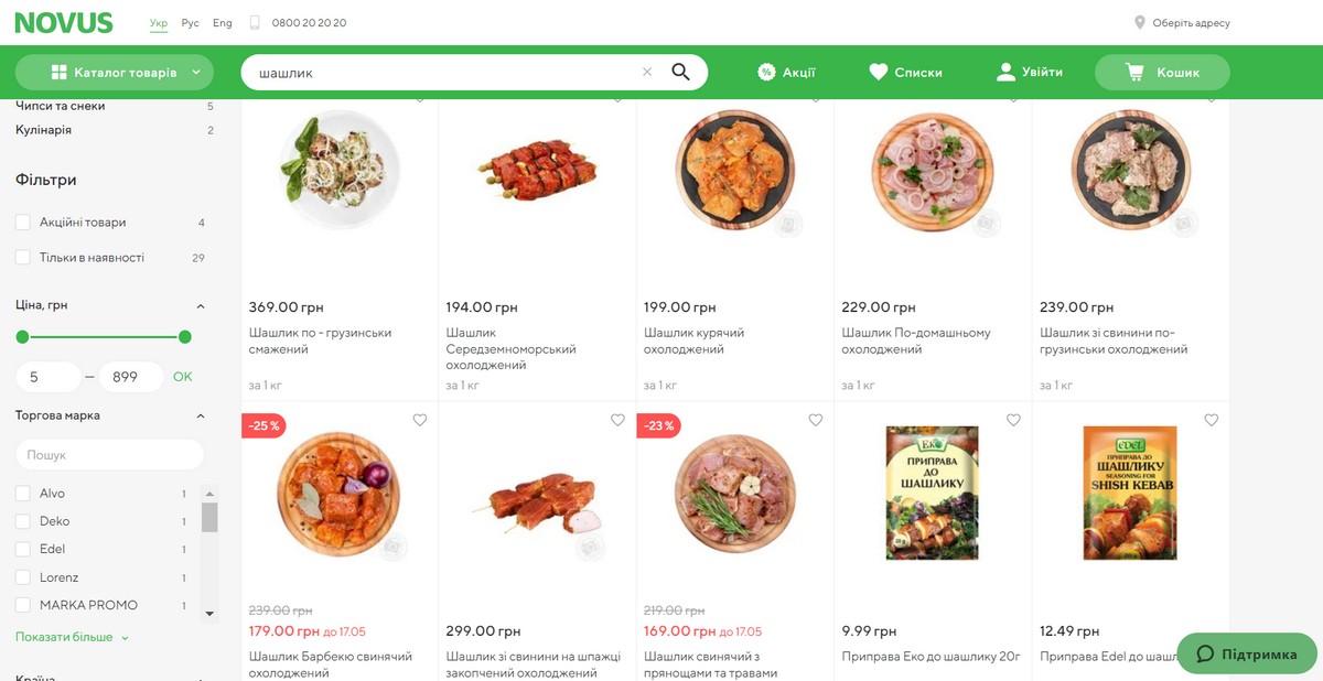 Так, например, в сети гипермаркетов Metro мясо для шашлыка из свиного ошейка по-домашнему и мясо для шашлыка по-кавказски стоят 248 грн за килограмм. А в сети Novus на маринованный шашлык из свинины действуют скидки, стоимость составляет 169 и 179 грн за килограмм. Куриный маринованный шашлык стоит 199 грн/грн.