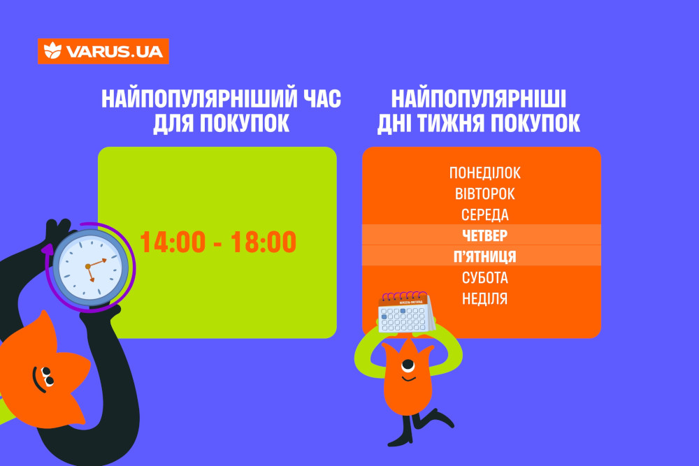 Абсолютными фаворитами по дням покупок среди клиентов varus.ua являются четверг и пятница. Что касается любимых часов, в которые чаще всего заказывают продукты, то это период с 14:00 до 18:00.