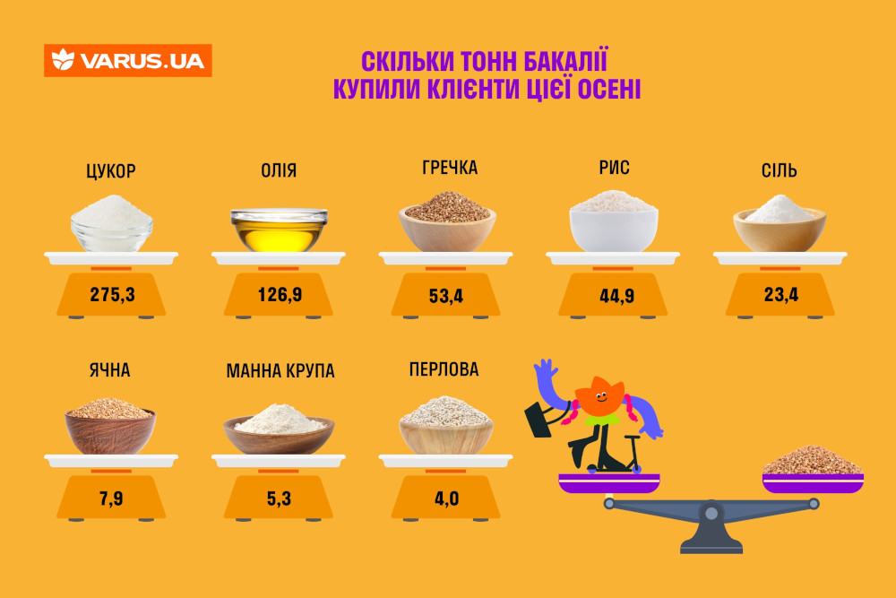 Клиенты varus.ua удивили своим выбором бакалеи в осенний период этого года. Как оказалось, больше всего украинцы выбирают сахар общим объемом продаж в целых 275,3 тонны. В другие популярные бакалейные товары вошли: