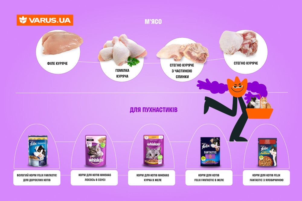 Нельзя обойти вниманием важную составляющую корзины клиентов – выбор мяса. Чаще выбирают курятину. Топовые позиции в заказах на varus.ua