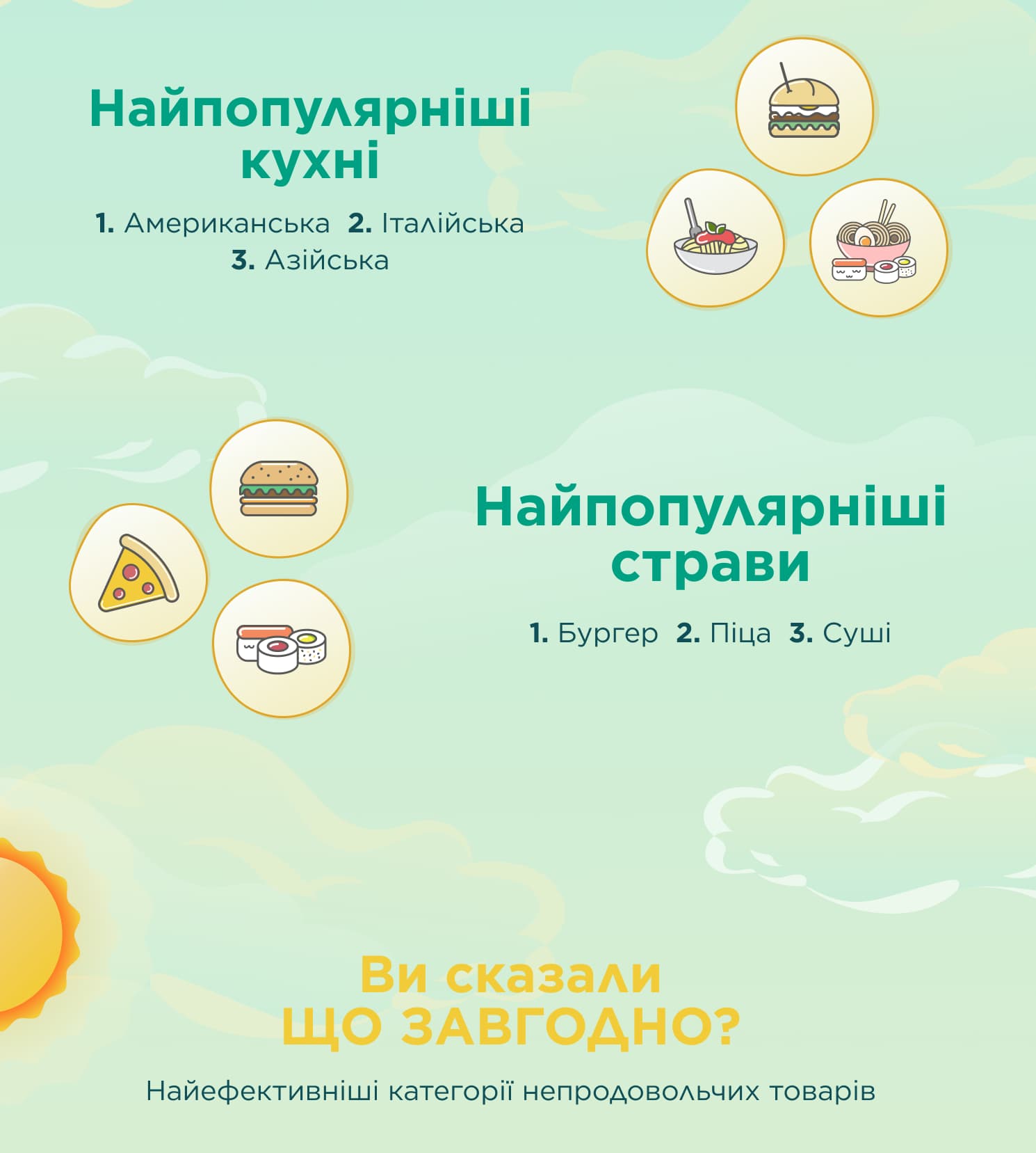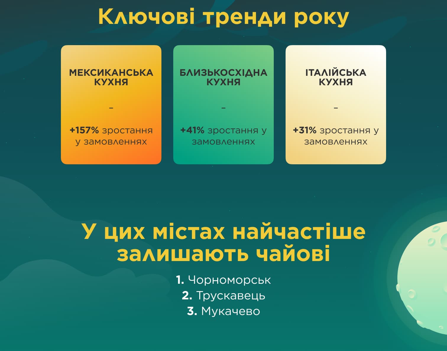 Самым крупным открытием 2022 года и главным food трендом на 2023 год стала мексиканская кухня. Количество таких заказов выросло на 157% по сравнению с прошлым годом. Кроме того, заметно вырос выбор ближневосточной и итальянской кухни – на 41% и 31% соответственно. В общем, предпочтения украинцев остаются неизменными – это американская, итальянская и азиатская кухни, а среди любимых блюд – бургер, пицца и суши.