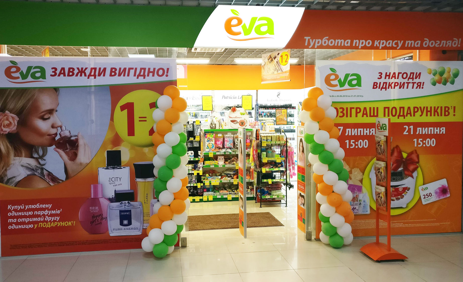 Сеть EVA насчитывает сейчас более 1060 магазинов (торговая площадь – 137 000 кв.м), а первый из них открылся в 2002 году в Днепре. В 2005-06 годах магазины этой сети начали появляться в Киевской, Донецкой, Одесской и Харьковской областях и постепенно с годами охватили и всю страну. В 2010 году EVA выпустила первый товар под собственной торговой маркой (ВТМ) «Управдом» (это было чистящее средство), а сейчас портфель таких товаров насчитывает более 50-ти позиций, а общий ассортимент составляет 30 000. Продукция собственных торговых марок EVA неоднократно отмечалась на мировом уровне.