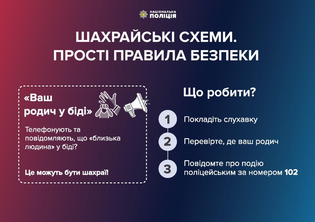 Если вам звонят по телефону (часто ночью или утром) и сообщают, что родственник попал в беду, и просят передать деньги – это мошенничество. Злоумышленники могут выдавать себя за сына или дочь, внука или внучку, якобы попавших в беду (совершили ДТП, оказались в полиции и т.п.). Мошенники могут представляться врачами или полицейскими и предлагать свою помощь в решении «проблемы» за вознаграждение, которое может составлять от 1000 до 10 000 грн, а иногда даже несколько тысяч долларов США. Помните: так поступают мошенники.