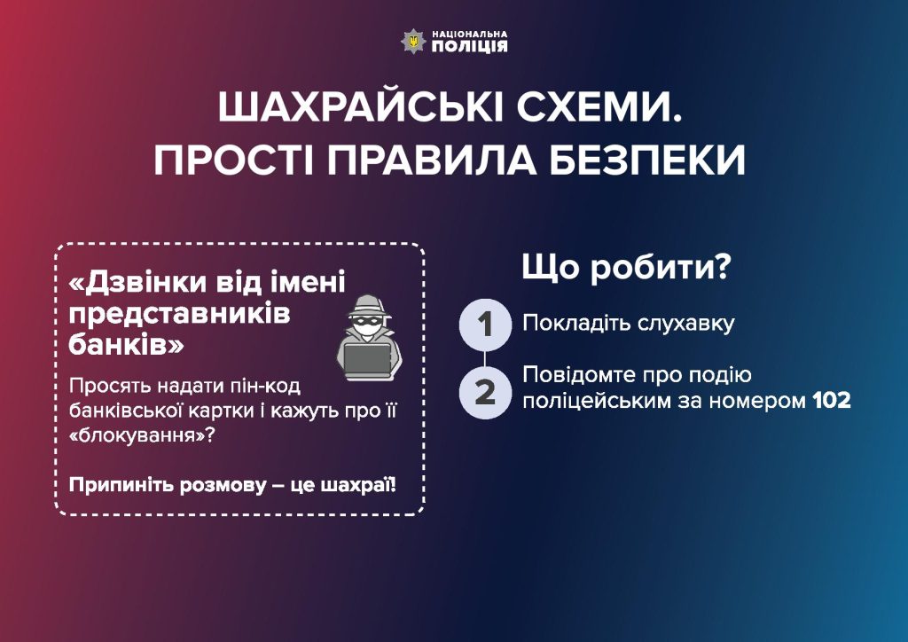 «Ваша карта заблокирована», «С вашего счета хотят списать деньги», «Новые правила во время военного положения» – злоумышленники, представляемые сотрудниками банка, используют разные способы, чтобы получить доступ к вашим банковским картам. Как только неизвестные просят предоставить номер карты, пин-код, кодовое слово, трехзначный номер на обратной стороне карты и срок ее действия или же ввести пароль, поступивший в смс, знайте: это мошенники. Помните: даже в условиях войны настоящие сотрудники банка никогда не спрашивают такой информации.