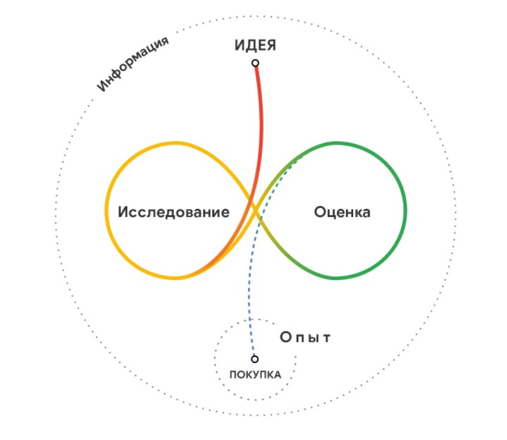 Интересно, что обе фазы идут не линейно одна за другой, они могут повторяться несколько раз, но не факт, что итогом будет покупка. В этой концепции важную роль играет опыт, который пользователь получает в процессе исследования, оценки, покупки, а также после нее, уже в процессе использования товара или услуги. Полученный опыт становится частью информационного поля, которое воздействует на пользователя и в фоновом режиме, и при следующем возникновении триггера к покупке.