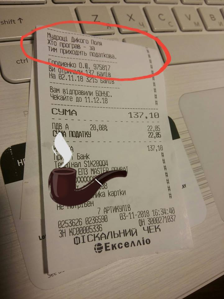 Пользователи соцсетей сразу начали делиться фотографиями с цитатами на чеке. На одном из них написано: “Кто проиграл, за тем приходит налоговая”.