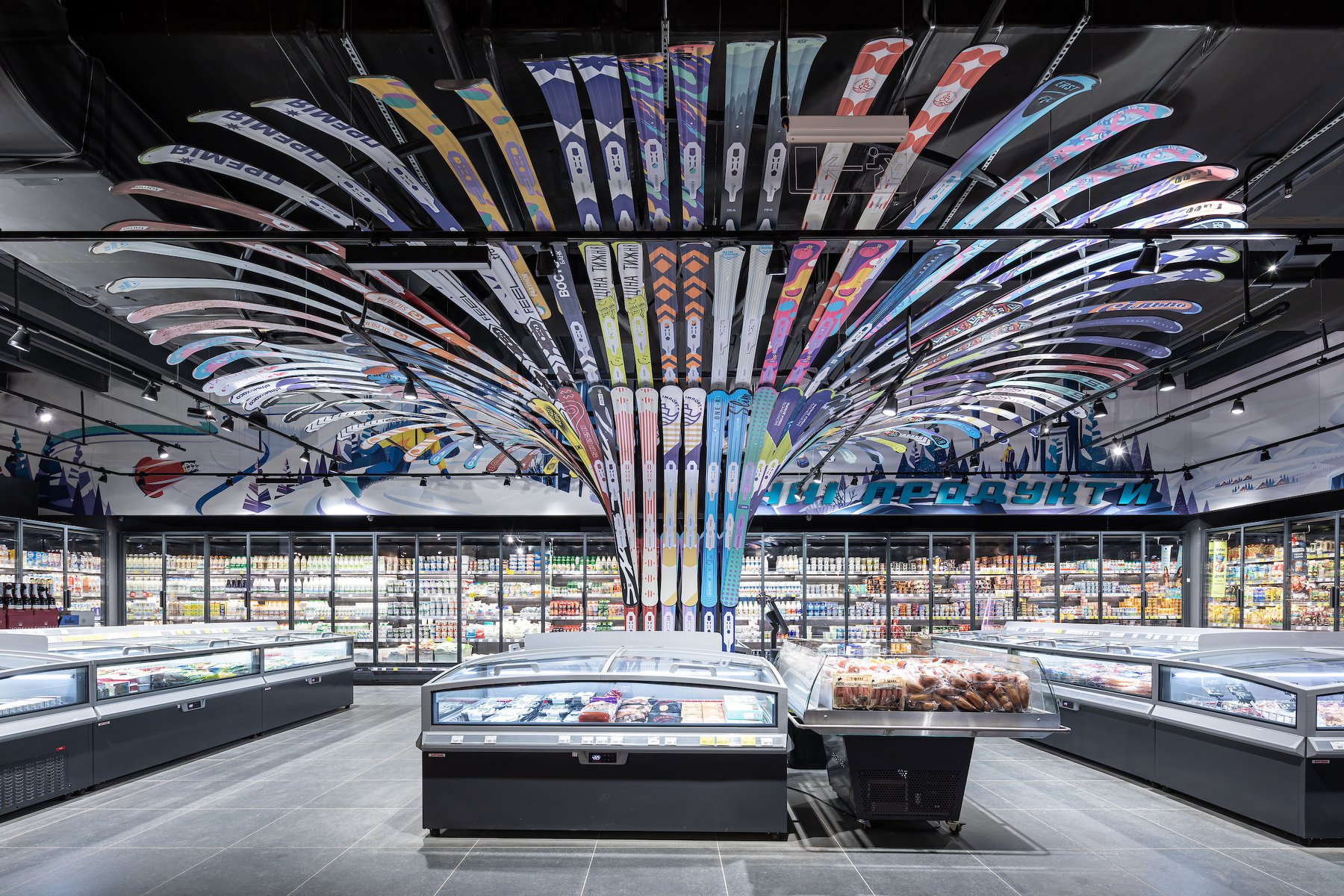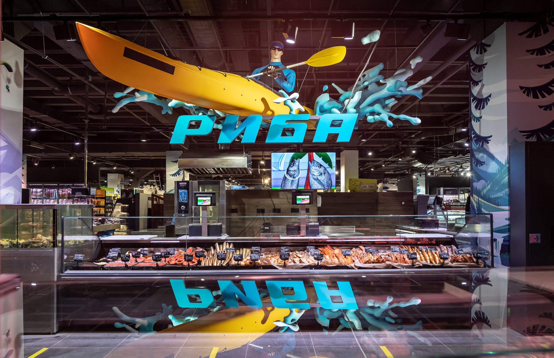 В отделе свежей рыбы гостей супермаркета будут удивлять динамичной установкой фрирайдера в каяке. В мясном и молочном отделах на посетителей ждут заснеженные трассы с лыжниками и сноубордистами.