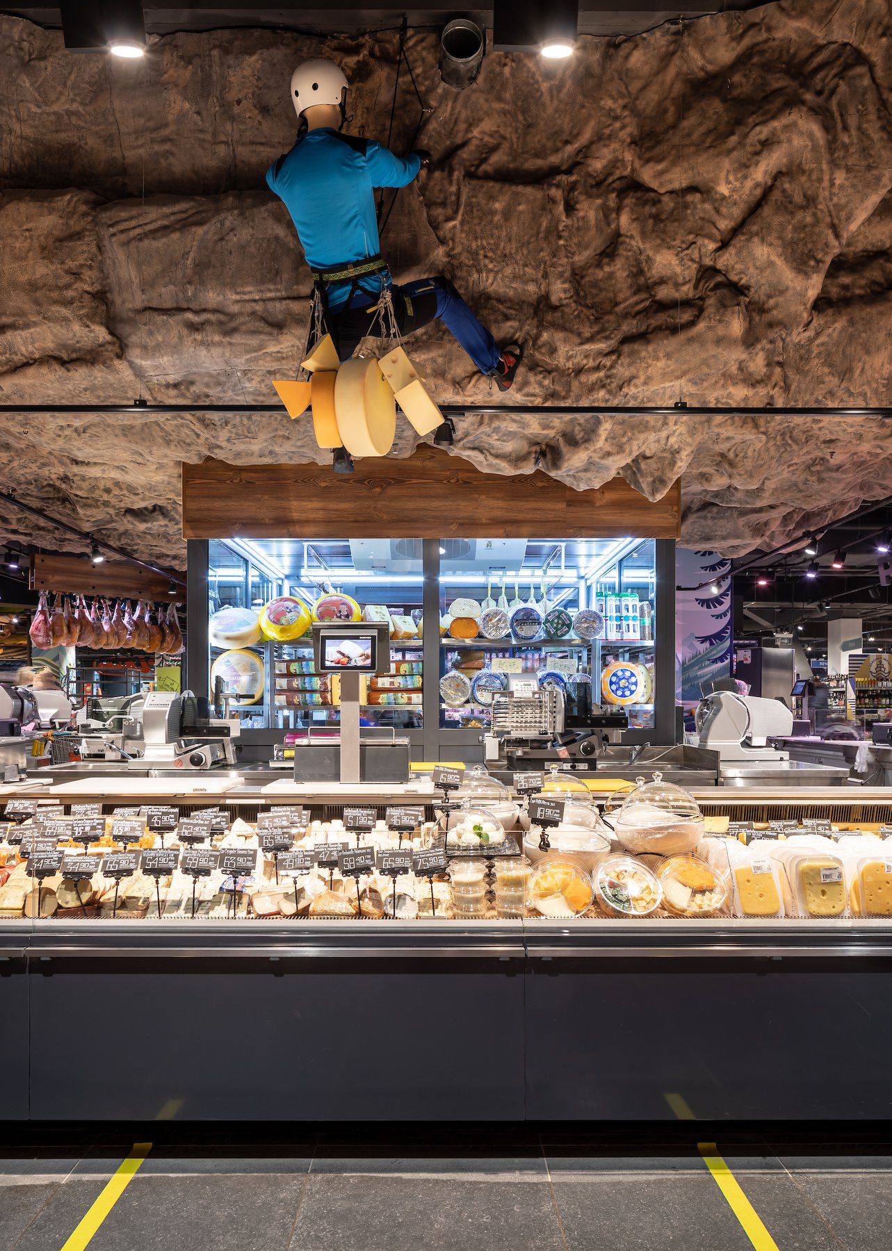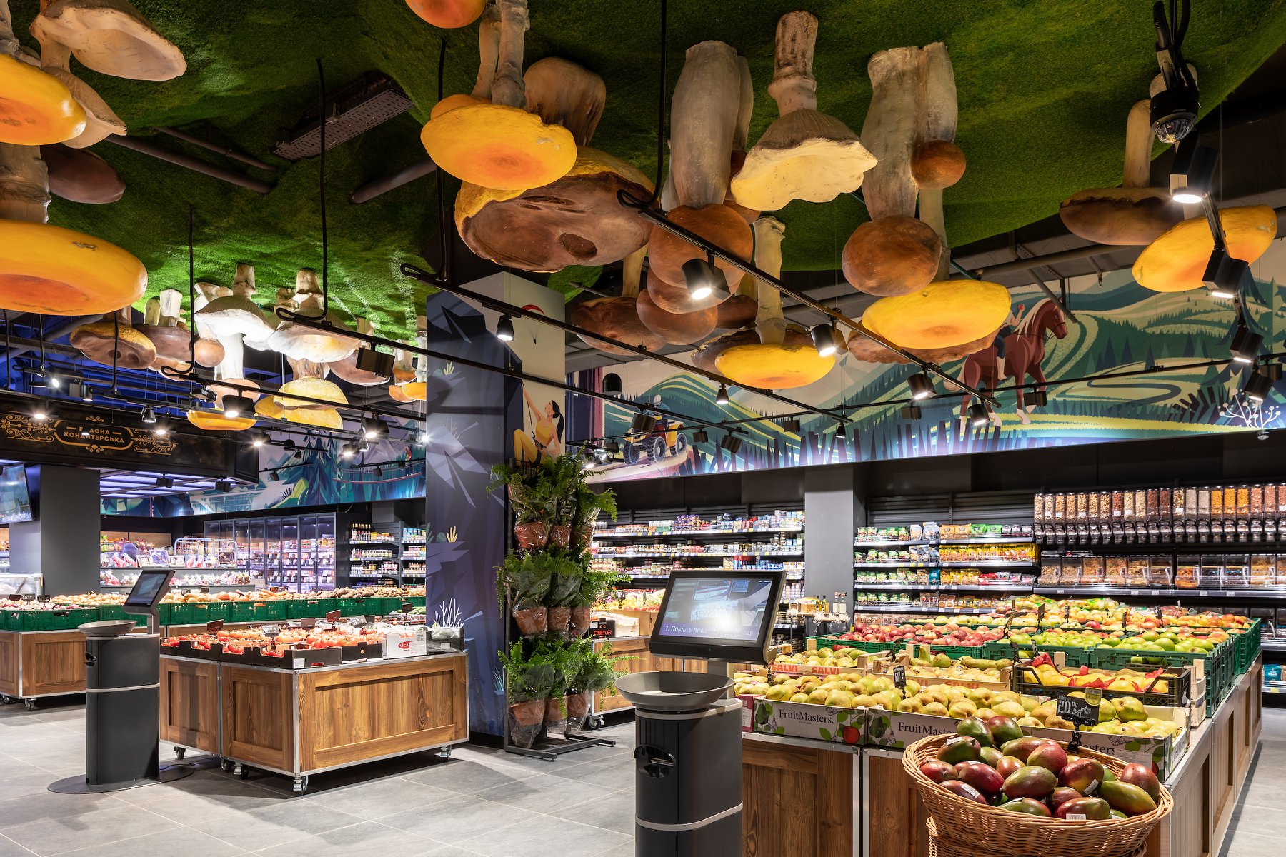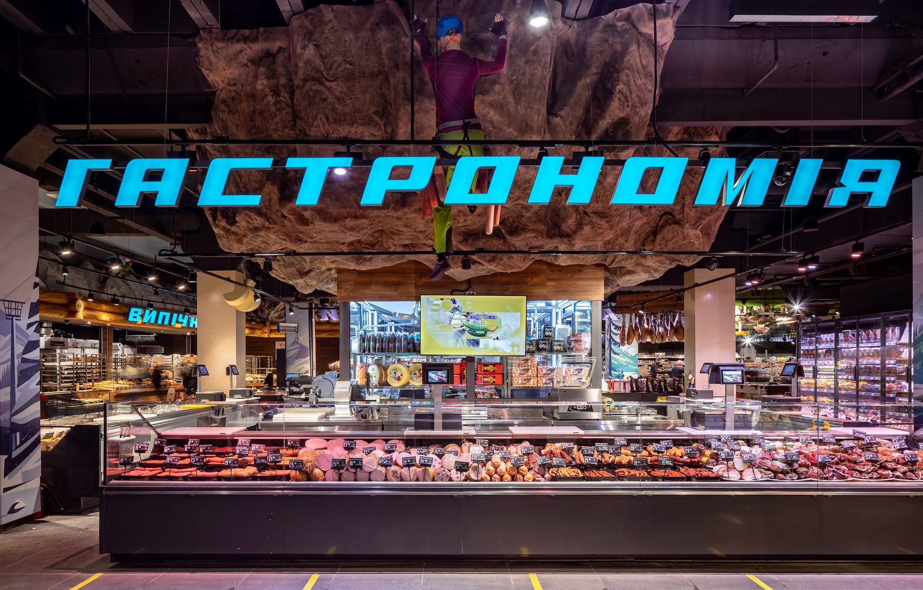 Как сообщила RAU пресс-служба ритейлера, 1800 кв. м торгового зала разделены на летние и зимние горные виды спорта и развлечения. Туристический маршрут в Сильпо сначала проходит под дельтапланами. Потом – грибной поляной и мимо огромной корзины голубики в отделе овощей и фруктов. Наверху в гастрономии можно увидеть скалолазов, которые дополнили свое снаряжение колбасками и сыром.