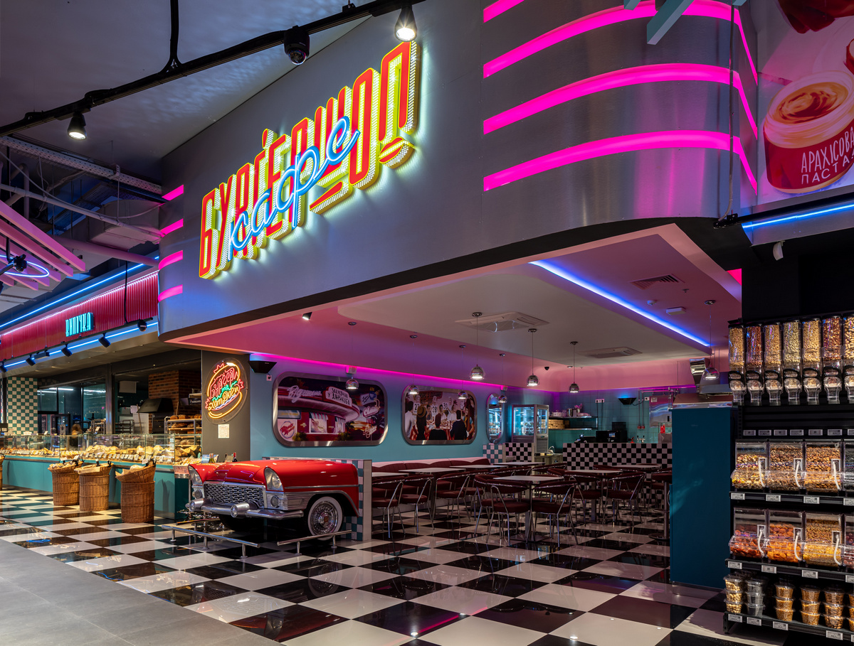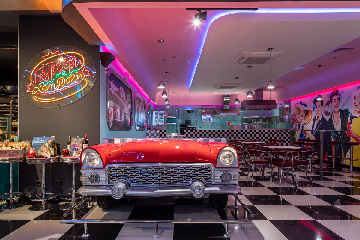 На 1997,8 кв. м торгового зала воссоздана атмосфера американских ретрокафе, занявших надежное место в мировом кинематографе и едва ли не самые узнаваемые культурные символы. Клетчатый пол, неоновые вывески, ретротелефон, виниловая мебель, легкость и кураж, присущий песням Элвиса Пресли.