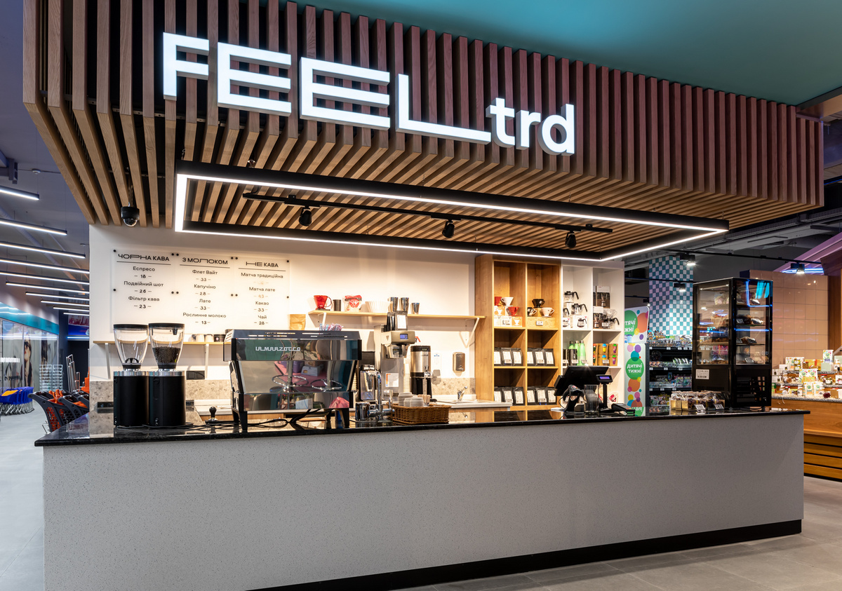 В новом магазине будет работать кафе FEEL__trd с кофе собственного обжаривания, а также яркий фуд-холл с бургерами и хот-догами, а еще с фотозона с настоящим ретроавтомобилем.