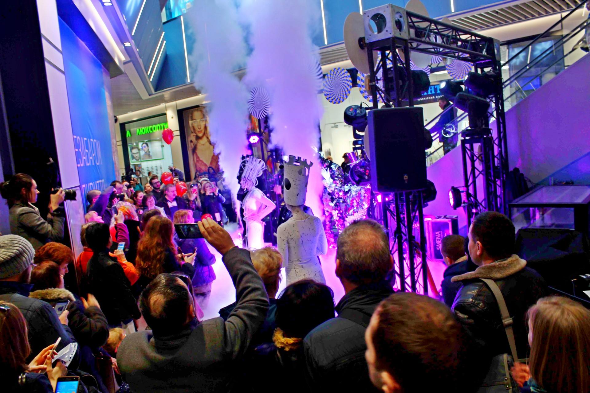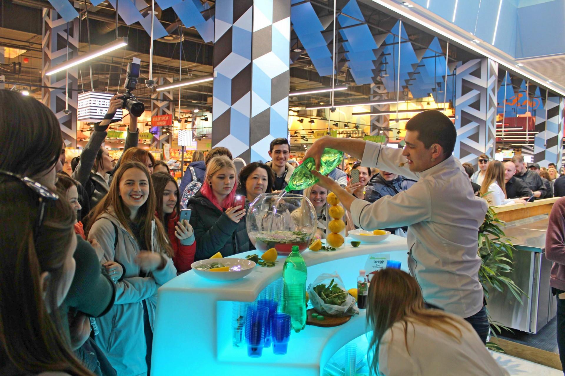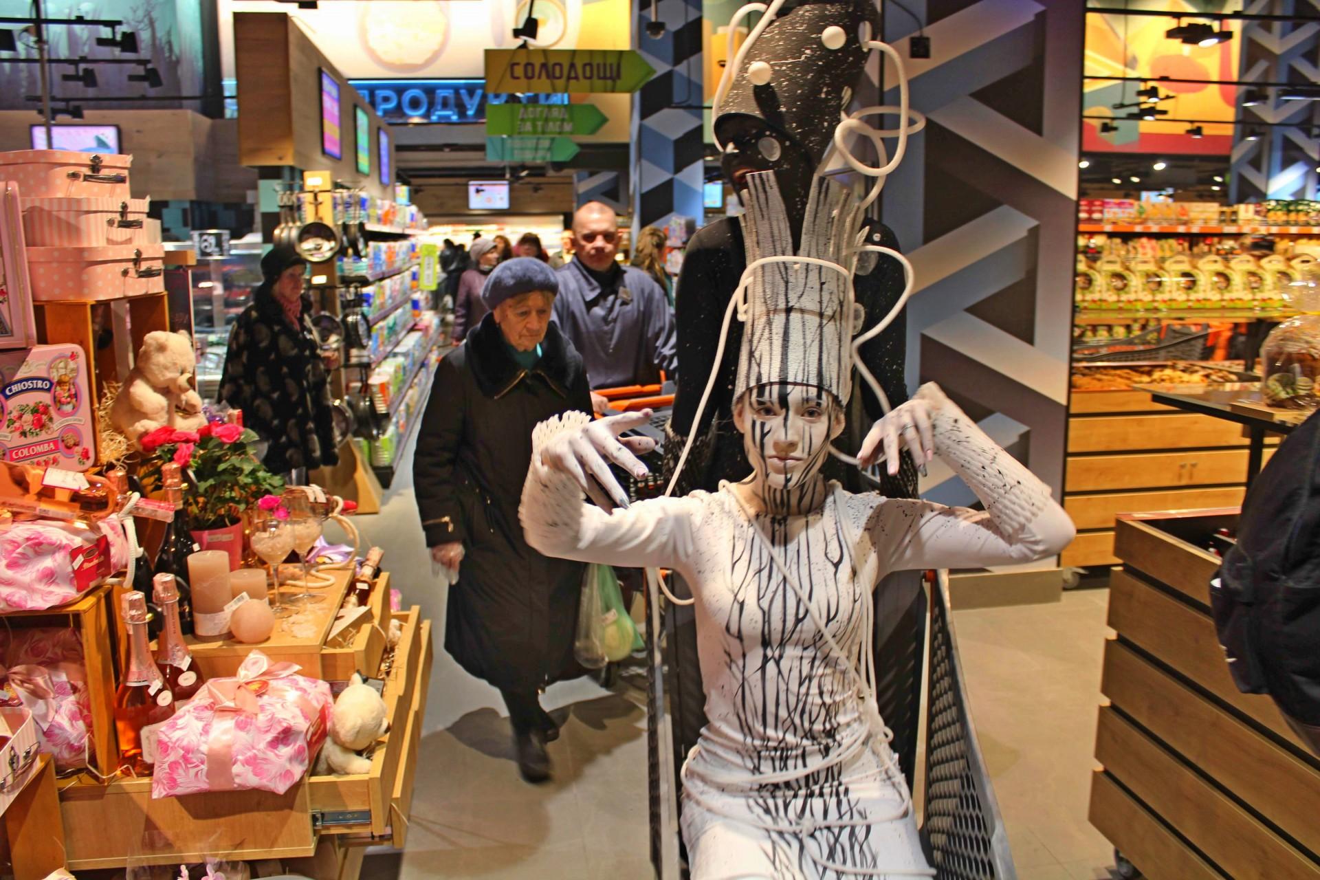 Встречал первых гостей супермаркет по-молодежному: с девушками, загримированными в фантастические движущиеся фигуры-иллюзии, оптическим шоу, диджеем и розыгрышами. Были и гастрономические “развлечения”, в частности, дегустация в самых разных отделах, в том числе, бесплатная пицца, что создало ожидаемой ожиотаж и толкучку при наплыве огромного количества людей пожилого возраста и местных зевак.