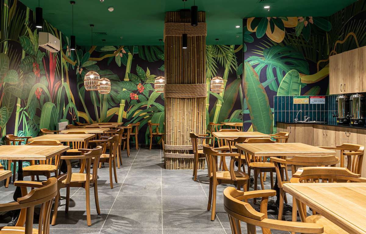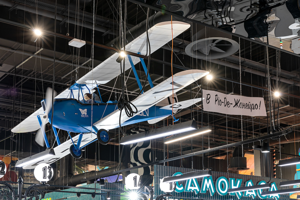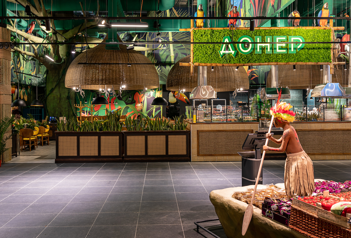 Посреди инсталляций деревьев, диких животных и птиц, под огромными люстрами из ротанга расположен уютный фуд-холл с несколькими кухнями мира. Здесь можно попробовать блюда итальянской кухни, пиццу на дровах, лапшу вок, суши, донер.