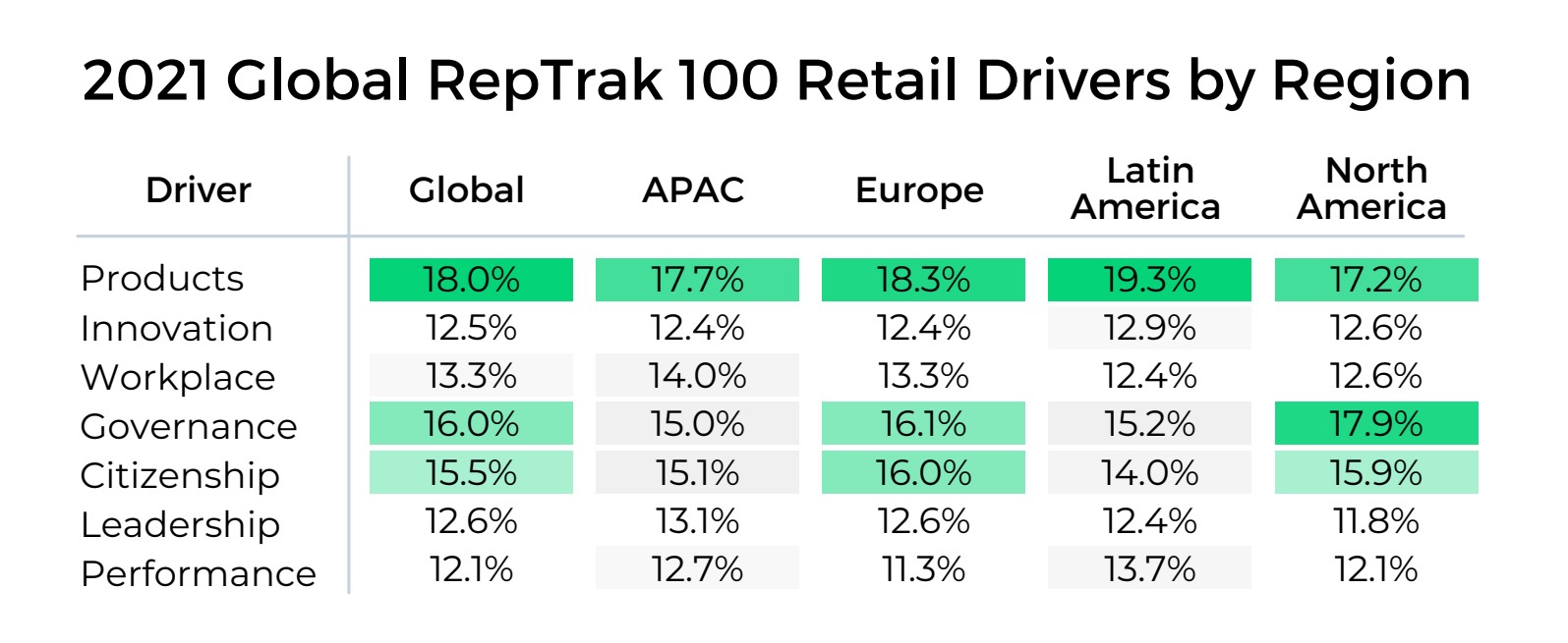 Согласно данным за 2021 год, продукты, управление и социальная ответственность бизнеса в ритейле становятся приоритетными во всех регионах мира.