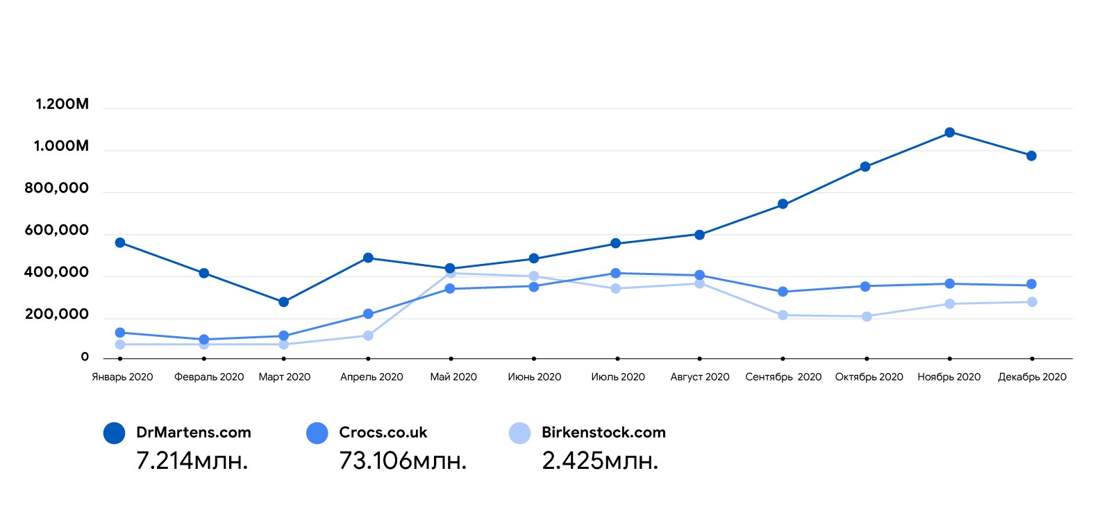 С марта по июнь 2020 года офлайн-магазины Великобритании были закрыты. Но три обувных бренда смогли преобразовать потерянную посещаемость в онлайн-трафик. Что еще удивительнее, траффик сохранился после открытия магазинов и даже вырос в IV квартале. Это было неожиданно, поскольку в этот период обувь теряла популярность, ведь люди стали реже выходить из дома. Чем больше аудитория, тем разнообразнее становятся ее запросы, поэтому бренды теперь могут быстро реагировать на новые тренды.