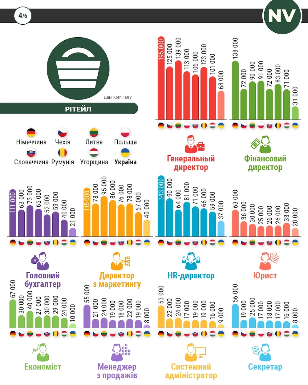 Если сравнивать зарплаты в Украине и ЕС в ритейле, то окажется интересная тенденция: сопоставимыми с европейскими коллегами доходы получают только юристы. Так, украинский юрист, работающий в розничной торговле, может рассчитывать на $20 000 в год. Практически столько же зарабатывают ритейл-юристы в Румынии, Словакии и Польше. В Германии на аналогичной должности можно получить $63 тысяч в год.