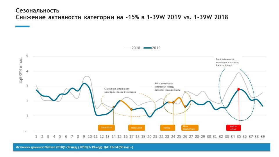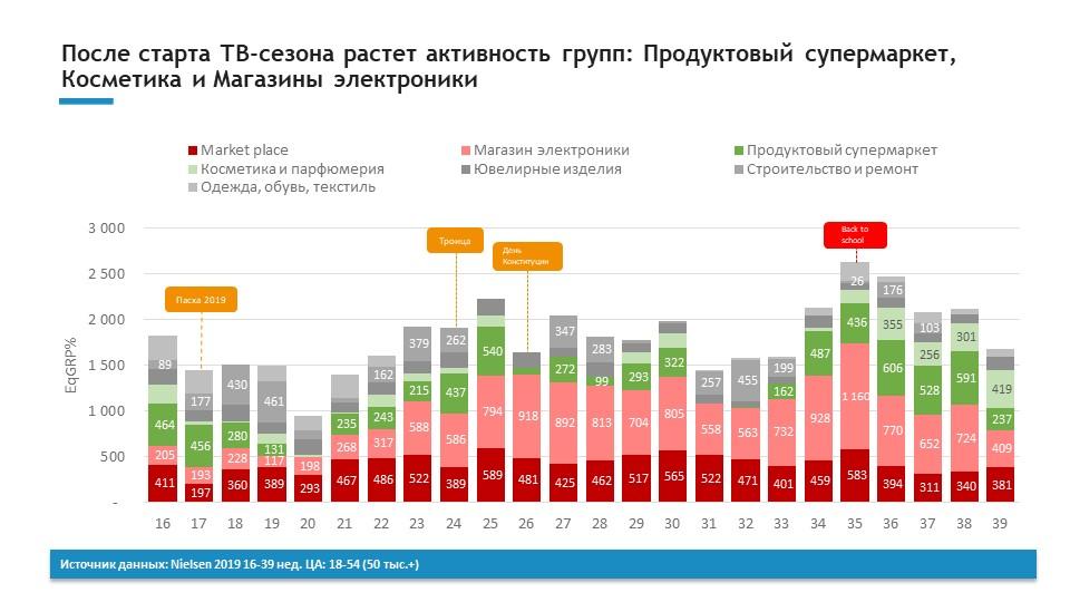 По сравнению с прошлым годом, активность ритейлеров на ТВ продолжает уменьшаться. Третий квартал не только не стал исключением, но и побил антирекорд падения. В среднем, за 2019 год падение ТВ-активностей ритейлеров по сравнению с 2018 годом составило 15%, а в третьем квартале разница еще более существенная – ритейлеры снизили свое присутствие на ТВ на четверть. И даже традиционное повышение ТВ-активностей накануне и сразу после 1 сентября не спасло ситуацию – пик активности был не таким значительным, как раньше (график 1).