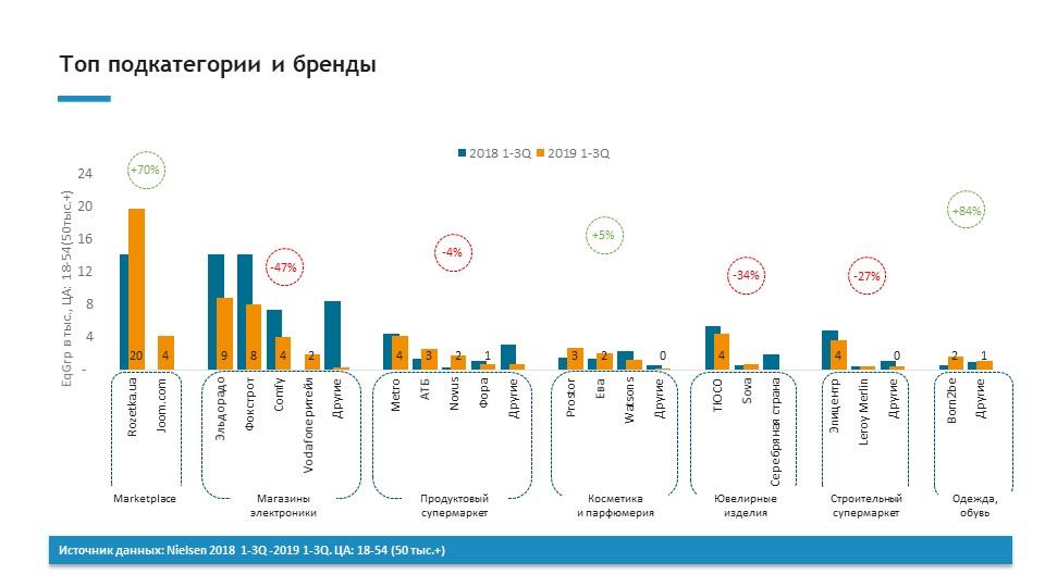 При этом анализ активности по категориям и брендам показывает, что по сравнению с прошлым годом, наблюдается значительное снижение активности магазинов электроники. И Eldorado, и Фокстрот, и Comfy значительно снизили количество купленных рейтингов на ТВ. Остальные категории и бренды покупали или столько же или больше.