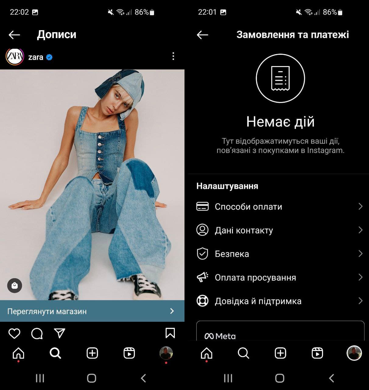 Последняя проблема украинский ритейл не затрагивает, ведь ограниченный доступ к новым функциям соцсетей давно стал нормой. Четыре года понадобилась компании Meta, чтобы позволить украинцам добавлять музыку в Stories из музыкальной библиотеки Instagram, два – чтобы предоставить доступ к Reels, а инструменты Instagram Shopping уже шестой год на этапе внедрения. Пока маркетологи США обсуждают, как лучше использовать Shopping Tags в Stories и Reels и тестируют функцию в директе, в Украине до сих пор даже не все пользователи могли заметить у себя появление раздела “Заказы и платежи” (см. скрин ниже). Так что вопрос, насколько украинские пользователи готовы делиться своей платежной информацией с соцсетями, проявится только со временем.