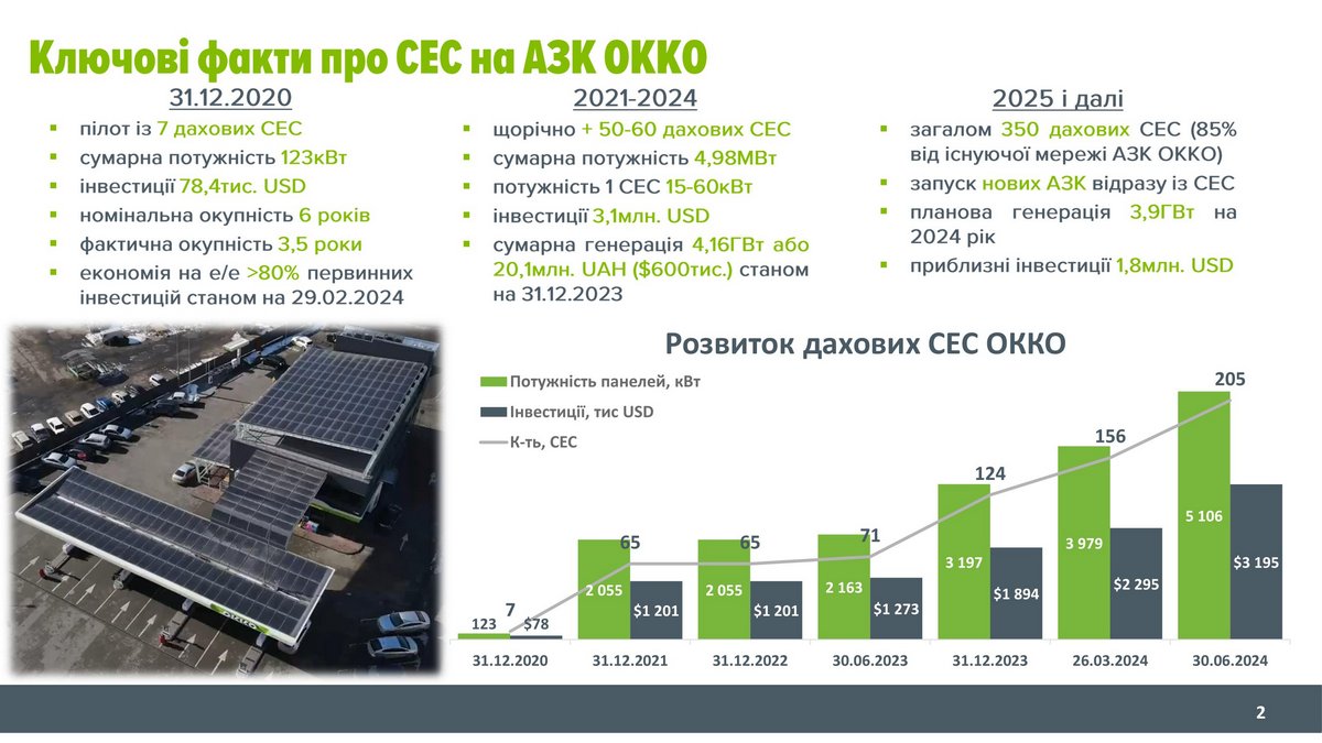 После первой неудачной попытки в компании не отказались от своей затеи, но более серьезно подошли к выбору локации и другим параметрам будущих станций. Так, сам тариф на электроэнергию состоит из трех частей: платы за саму энергию, ее доставку и распределение. И в разных регионах это разные суммы. Поэтому, например, было решено ставить СЭС не в Днепре, а в Закарпатье. И не по зеленому тарифу (когда государство стимулирует выплатами зеленую генерацию энергии в сеть), а для самообеспечения. Этот проект из семи солнечных станций на крышах АЗК начал работу в последний день 2020 года. Исходя из тогдашних тарифов, инвестиции в размере $78 000 имели расчетный срок возврата в шесть лет. Но по факту эти расходы удалось компенсировать за 3,5 года. Экономия на оплате электроэнергии на 29 февраля 2024 года уже превысила 80% расходов на СЭС. Поэтому, не дожидаясь полной окупаемости, сеть ОККО в 2021 году оснастила СЭС еще 58 автозаправочных станций.